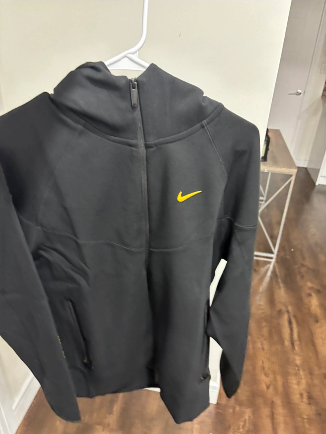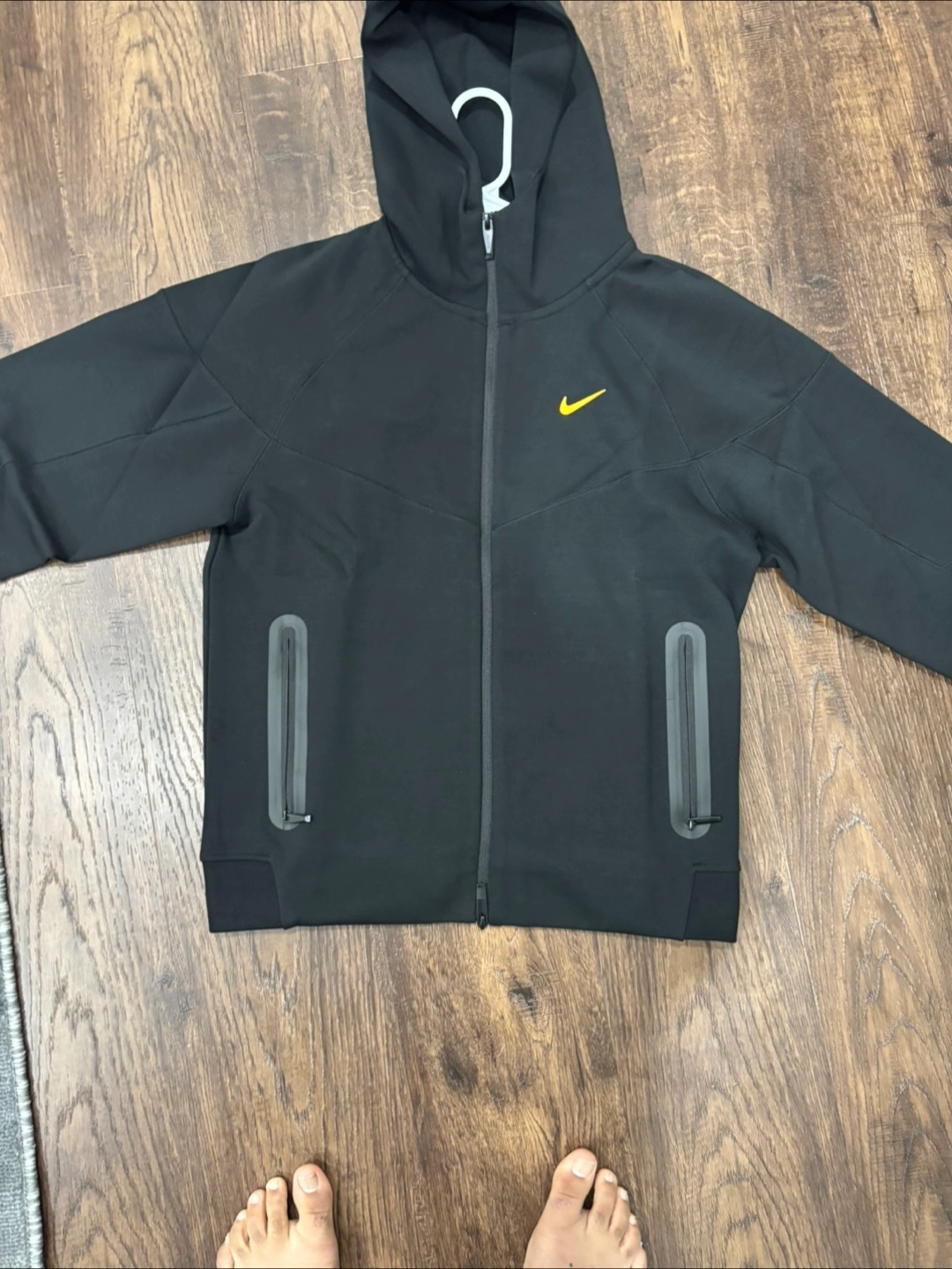 Selling a Nike Tech Fleece hoodie in black. It's in great condition and perfect for layering or wearing on its own. The hoodie features a full zip, a hood, and pockets with zippers.