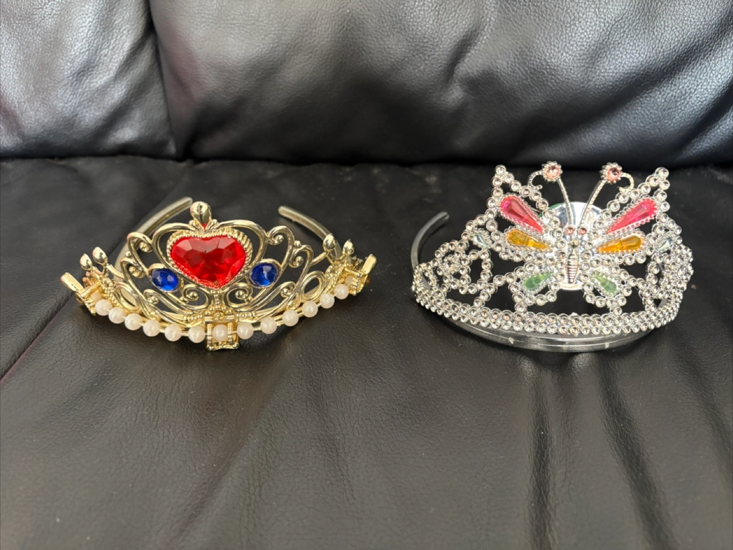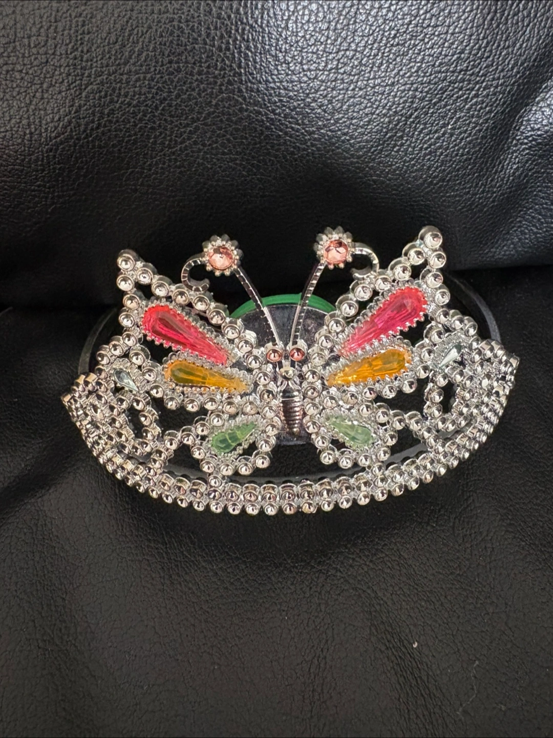 - One silver-coloured crown with a butterfly design and colourful jewels.