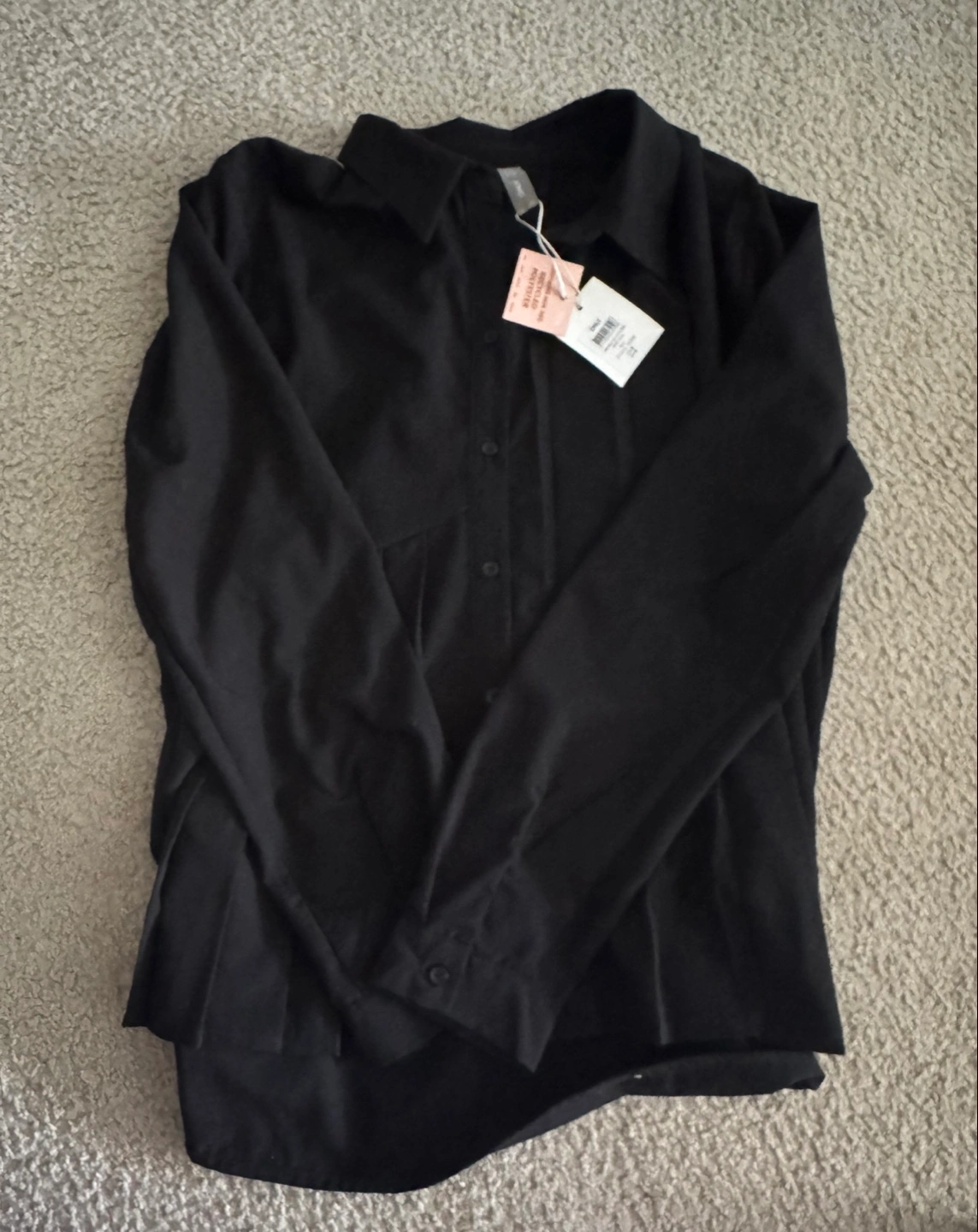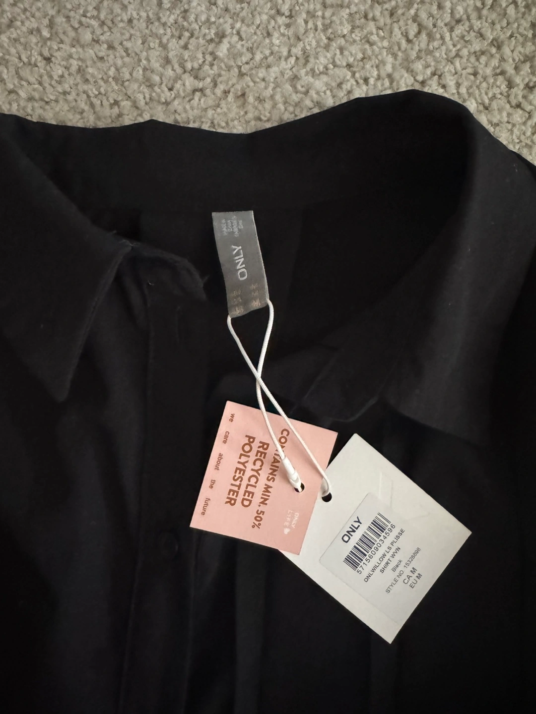 I'm selling a brand new ONLY black shirt in size M! It's made with 50% recycled polyester, which is pretty neat. This shirt is stylish and comfortable, perfect for any occasion.