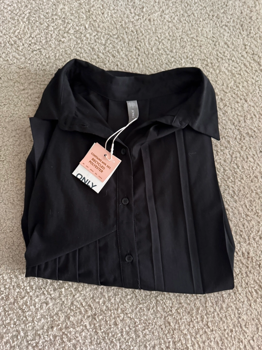 I'm selling a brand new ONLY black shirt in size M! It's made with 50% recycled polyester, which is pretty neat. This shirt is stylish and comfortable, perfect for any occasion.
