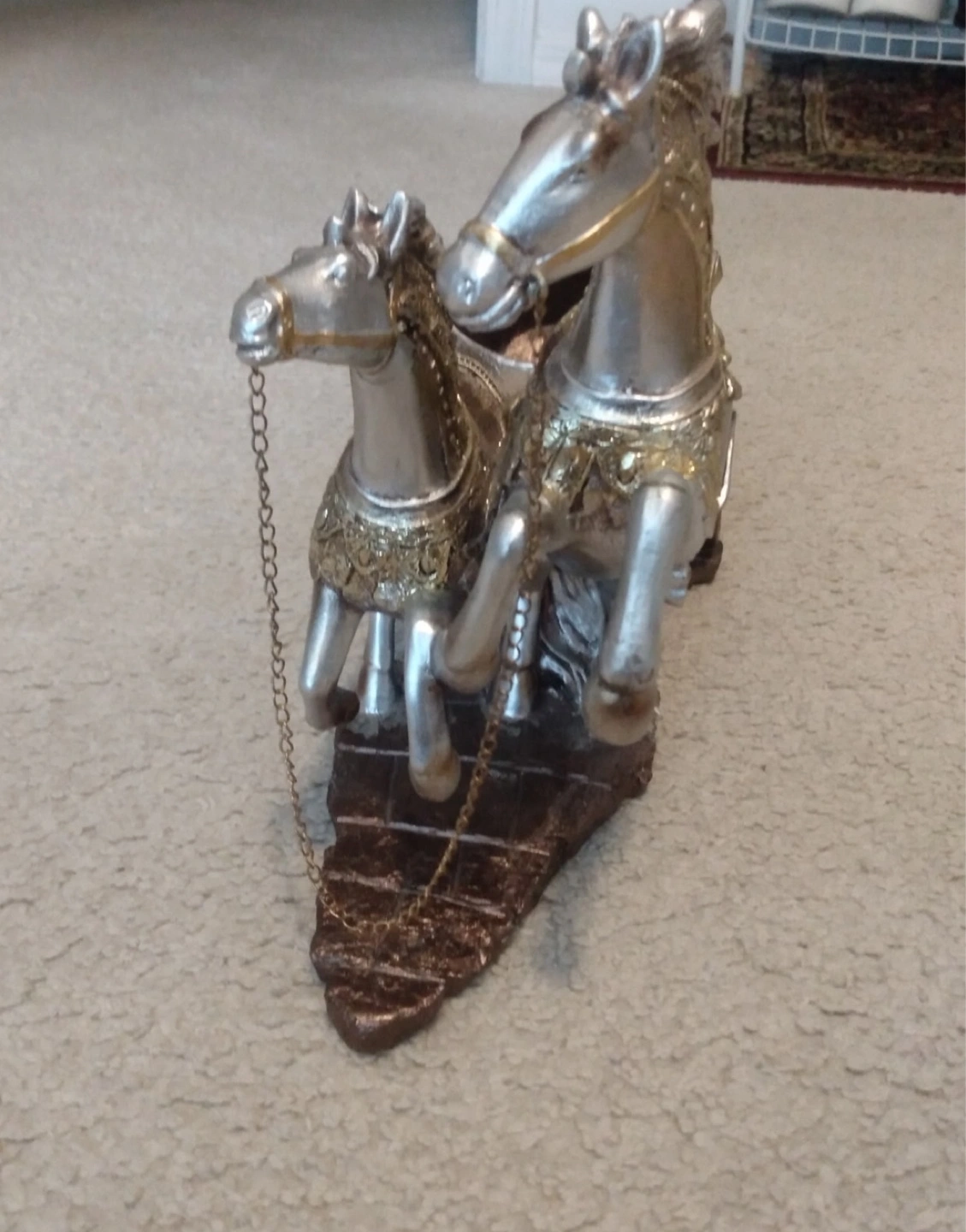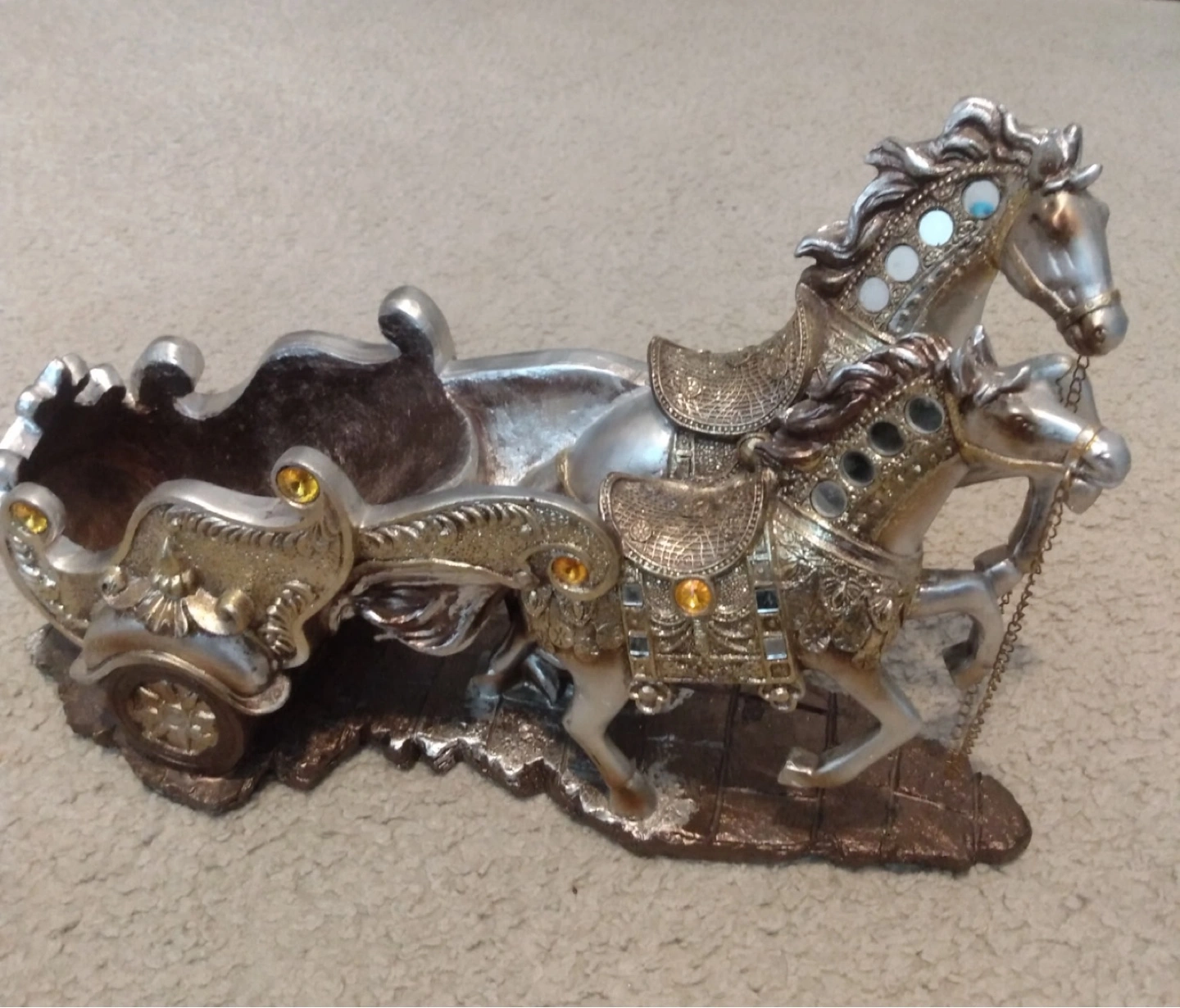 Unique and eye-catching wine holder featuring two silver horses pulling a carriage designed to hold a wine bottle. Perfect for displaying your favorite wine on a dining table, bar, or as a conversation piece.