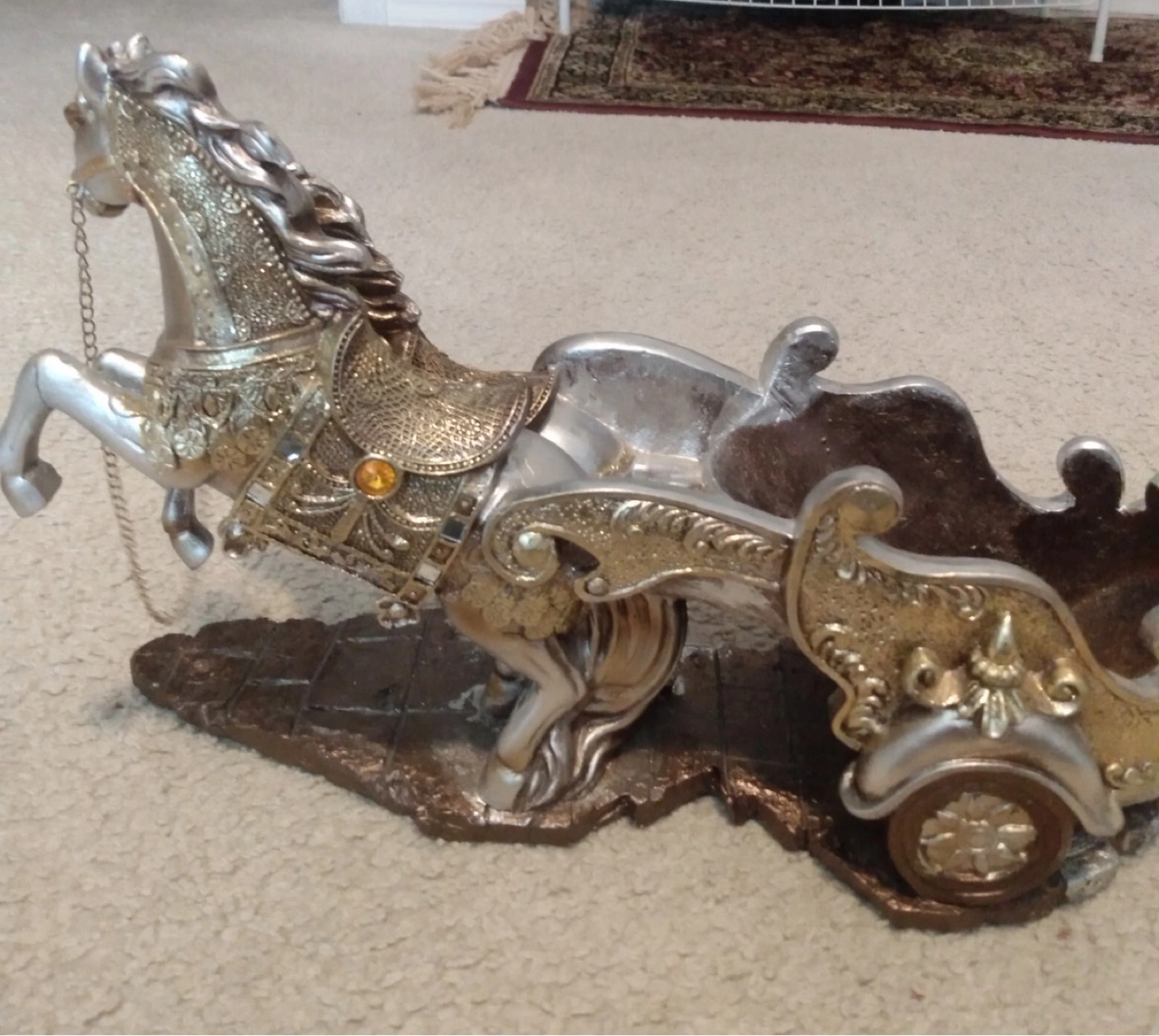 Unique and eye-catching wine holder featuring two silver horses pulling a carriage designed to hold a wine bottle. Perfect for displaying your favorite wine on a dining table, bar, or as a conversation piece.