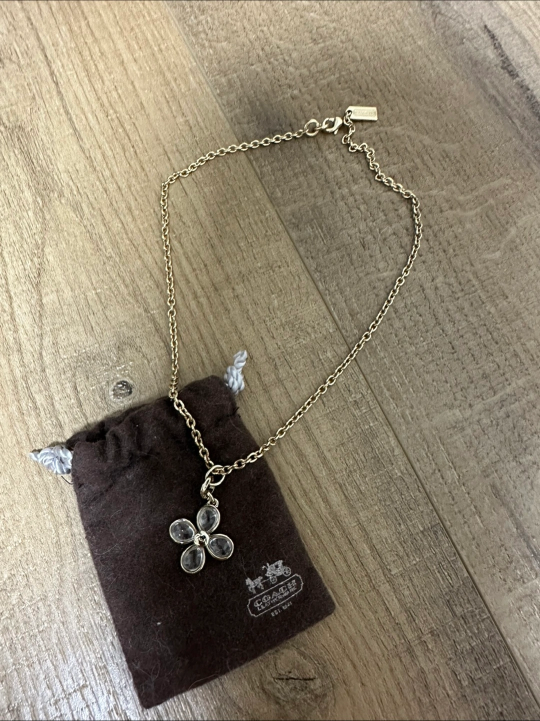 Selling a Coach flower pendant necklace. It's in great condition and comes with its original pouch! The pendant features a delicate flower design with clear accents, adding a touch of elegance to any outfit. Perfect for everyday wear or special occasions