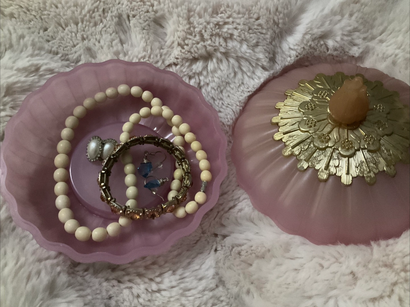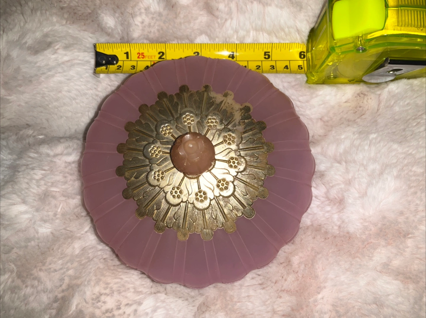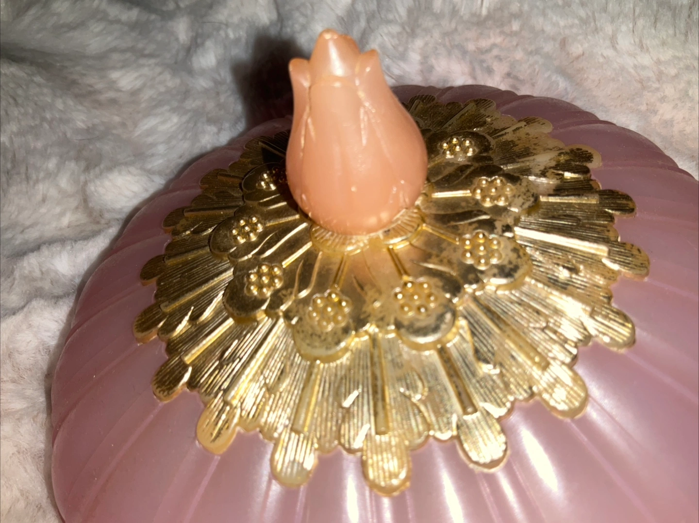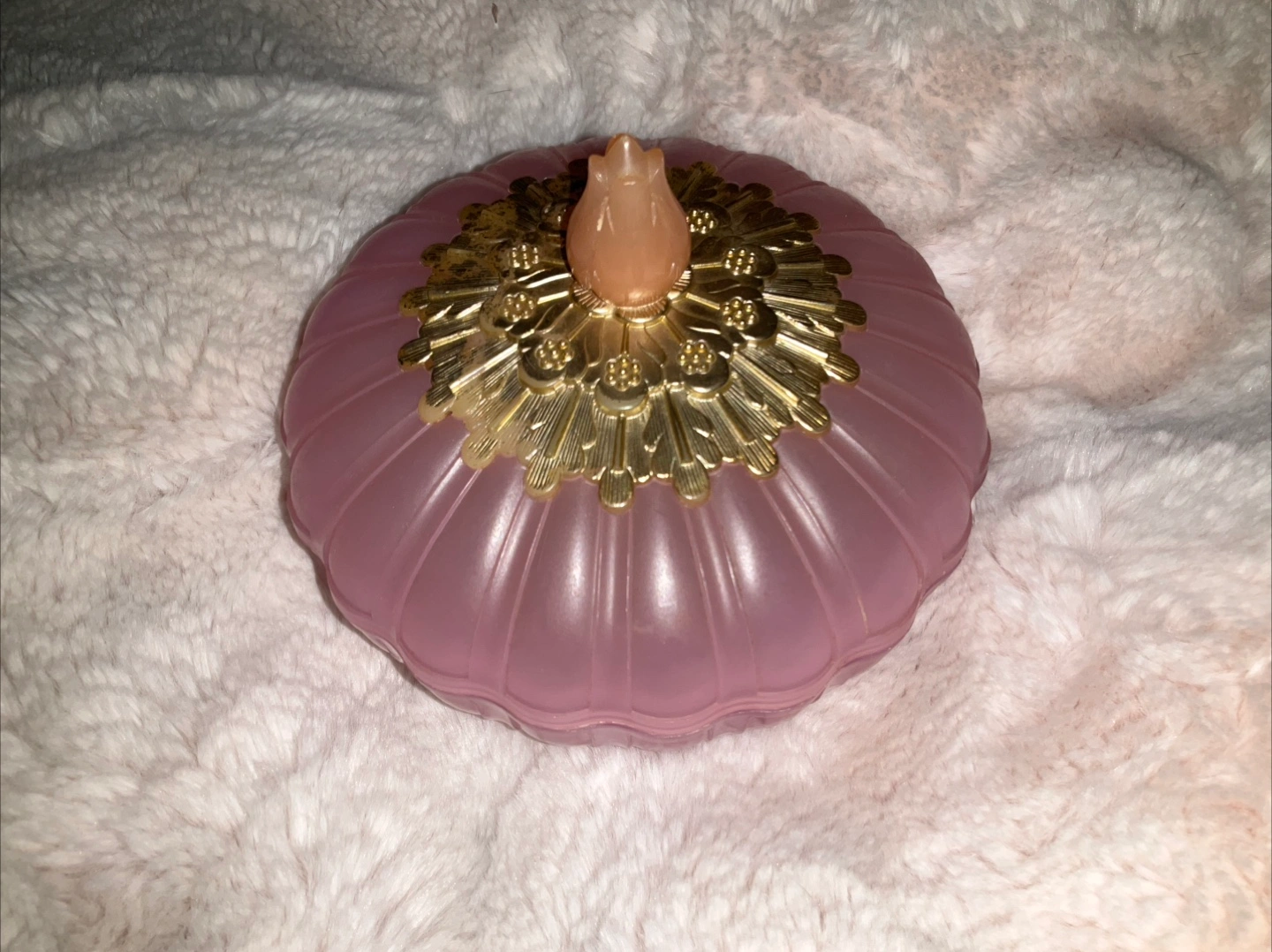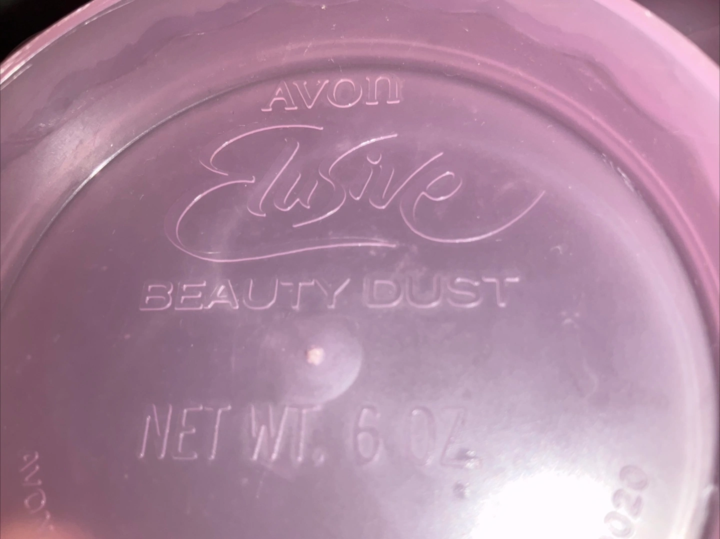 Selling a vintage Avon Elusive Beauty Dust powder jar. The container has a beautiful design with a golden floral accent and a tulip-shaped knob. Made of a hard plastic . ( jewelry not included )