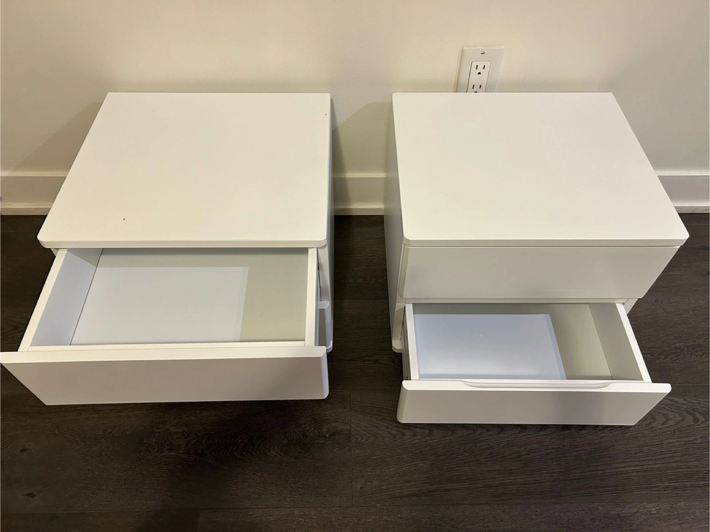Selling a pair of white nightstands for $60. Each has two drawers for storage.