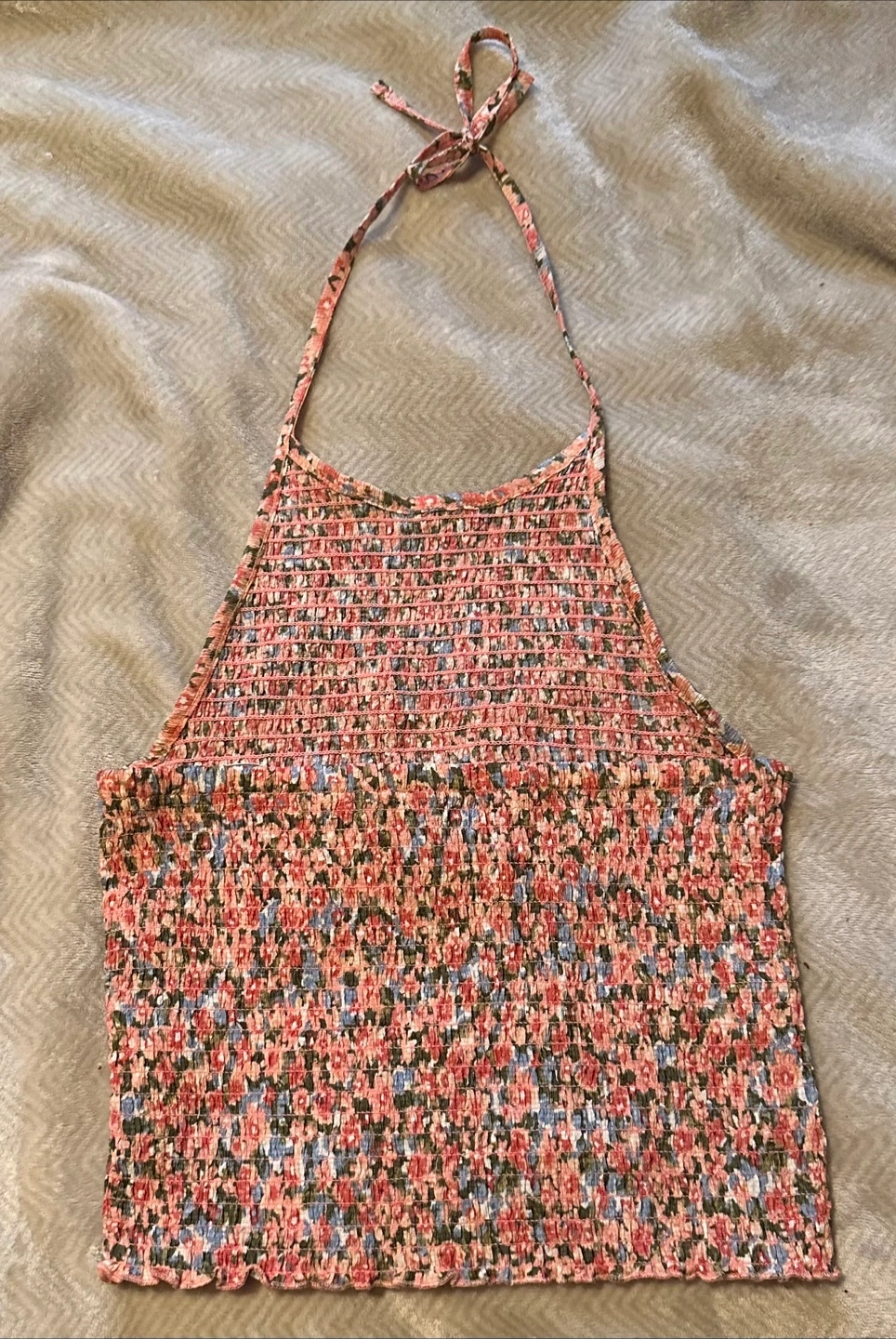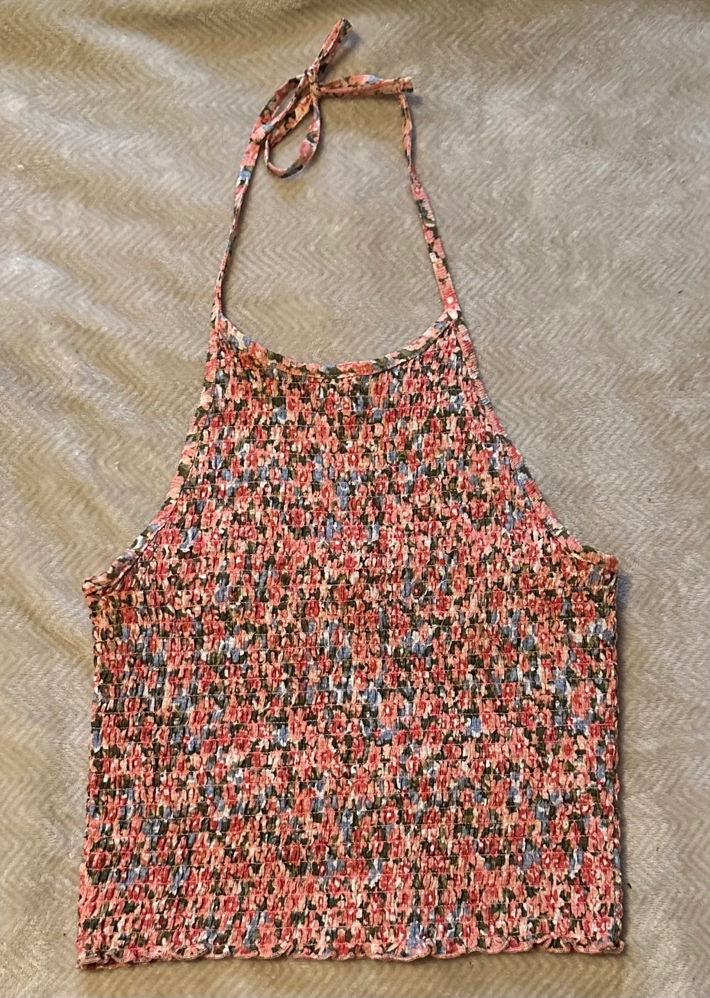 65Here's a cute floral smocked halter top! It's perfect for summer and is in great condition. The smocked design makes it super comfy and flattering. The floral pattern has a mix of pink, blue, and green. It's a size medium