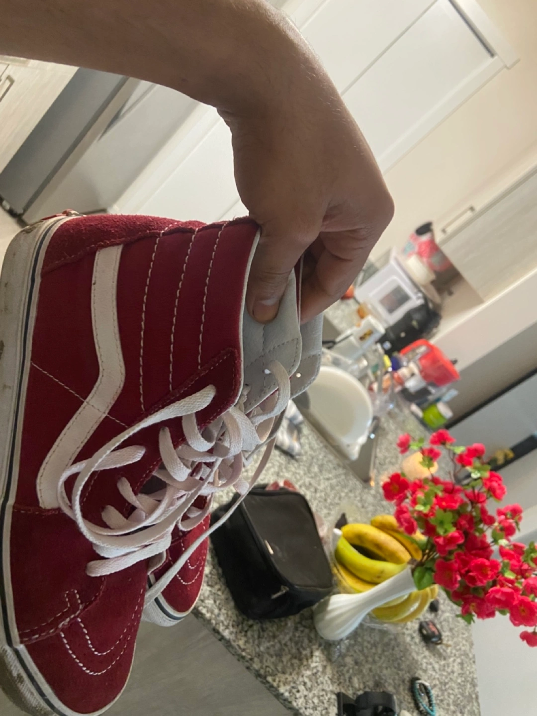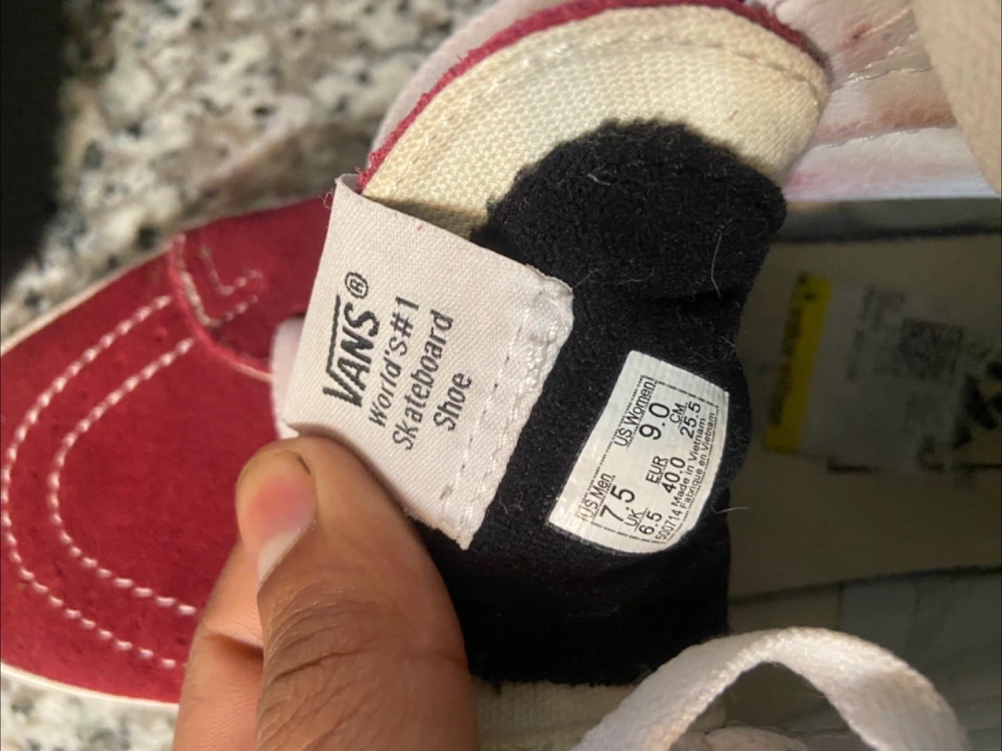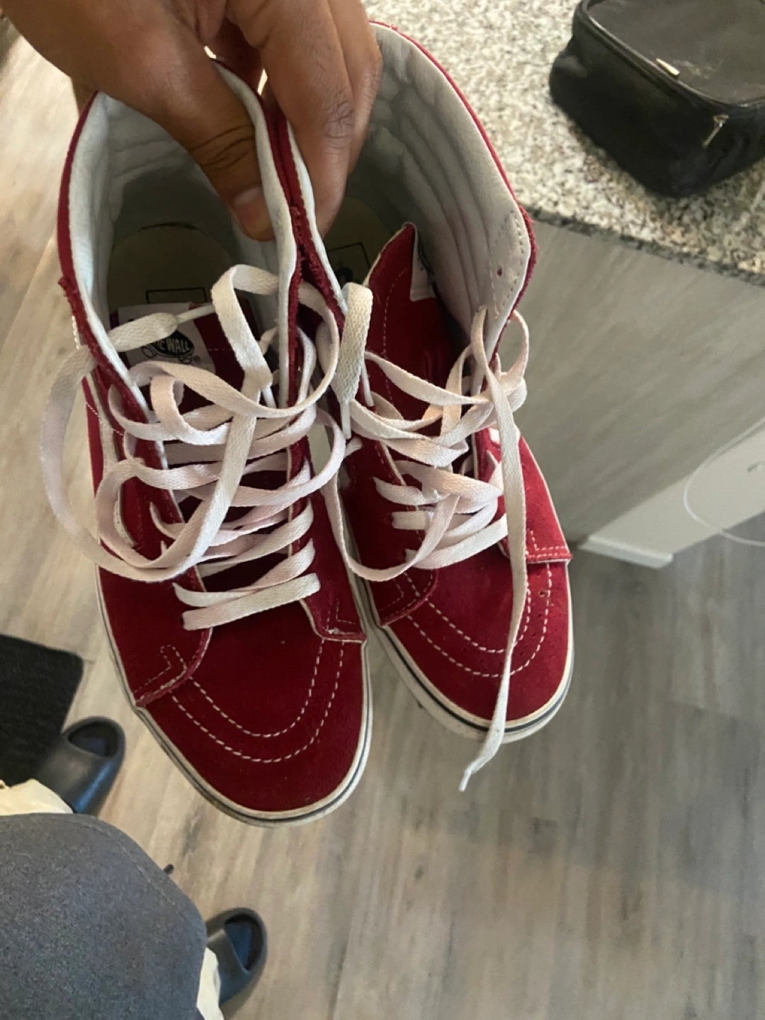 25Selling a pair of Vans Sk8-Hi sneakers in red and white. They are in US men's size 7.5 & women 9.0 A classic skateboard shoe!
