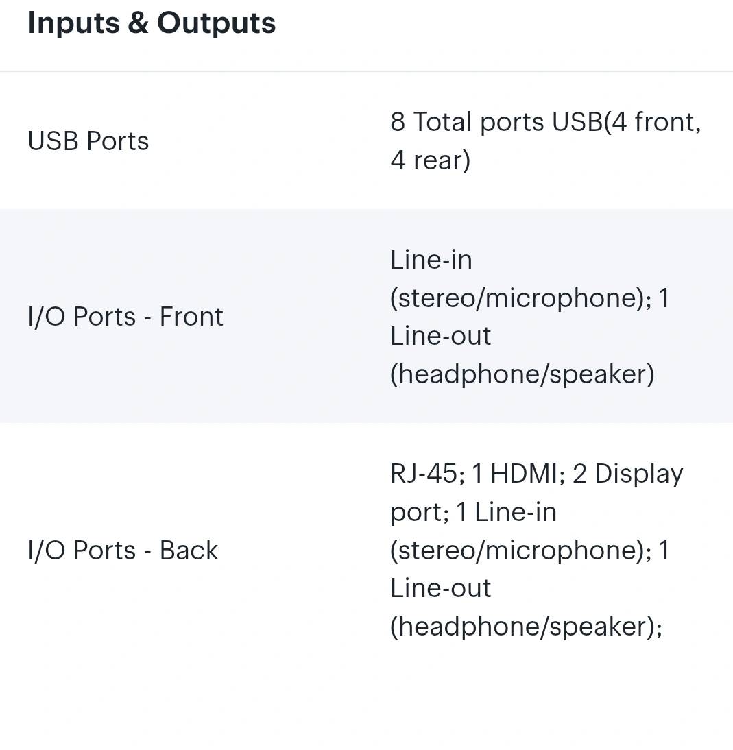 The compact design saves space, and it runs Windows 10 Pro with advanced security features. There are 8 USB ports (4 front, 4 rear) and multiple I/O ports for connectivity.