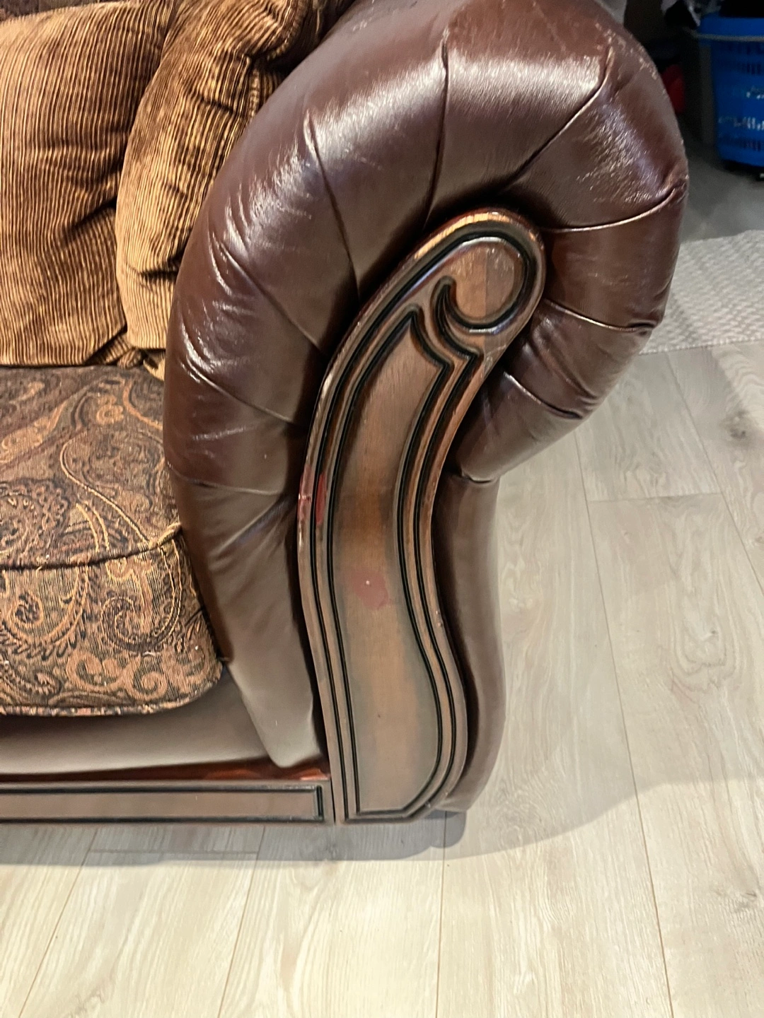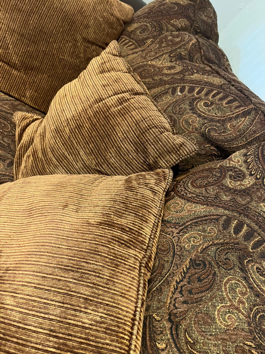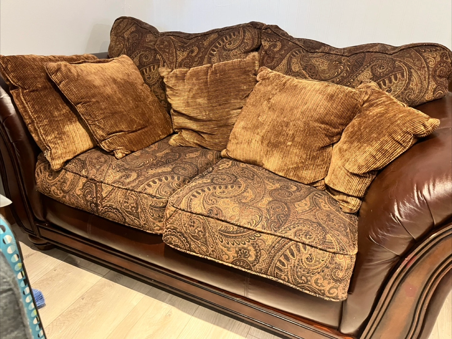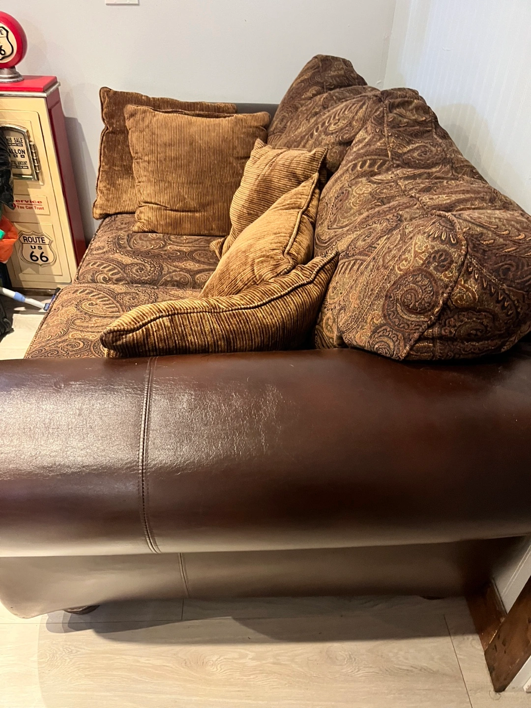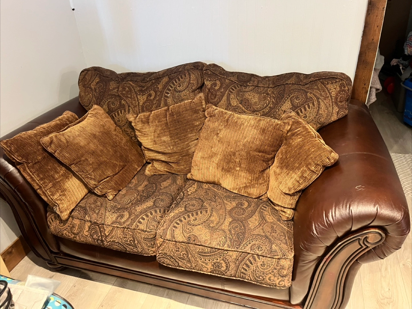 A comfy brown loveseat with a patterned fabric and matching cushions. It's in good condition and ready for a new home!