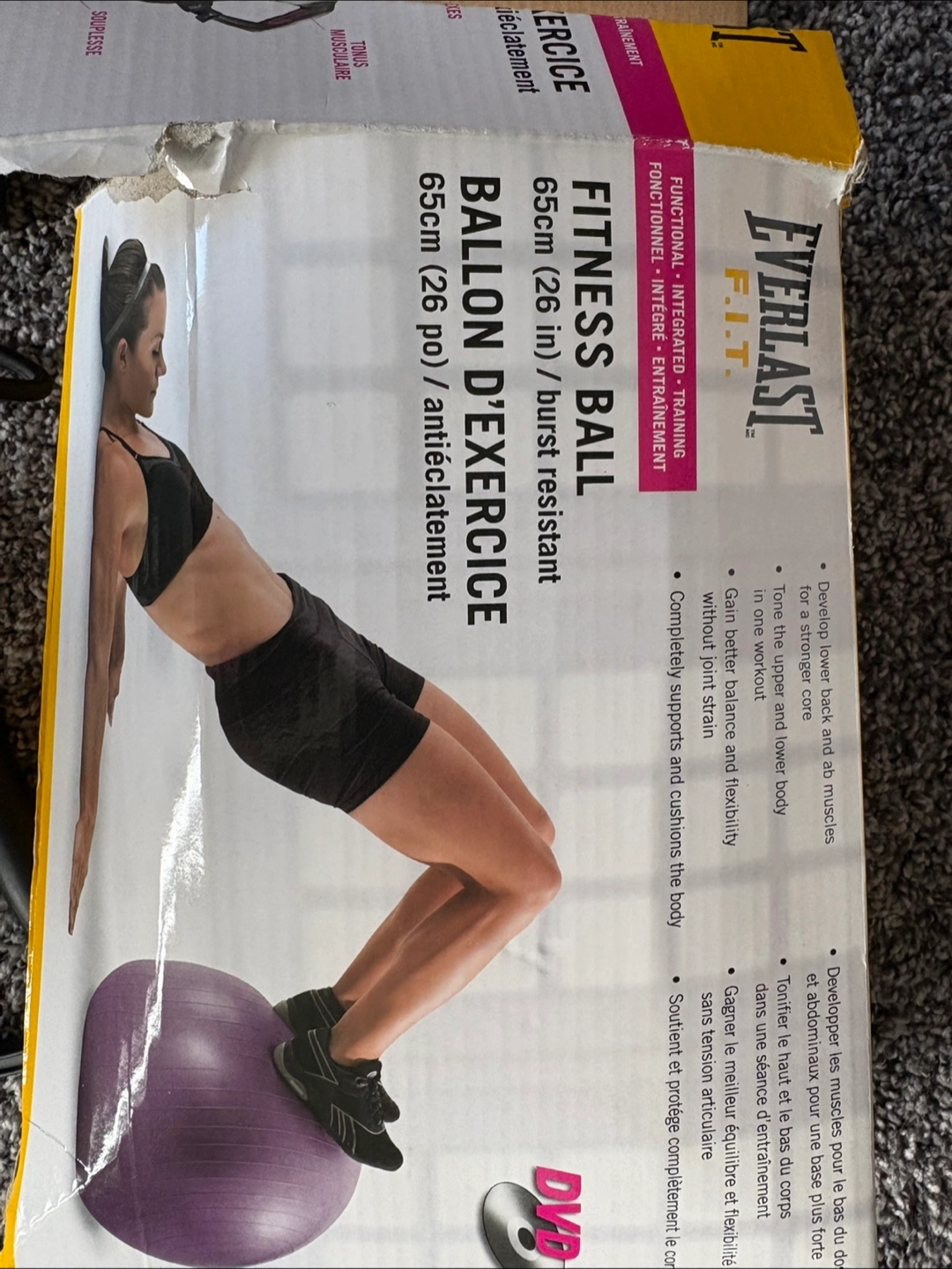 Selling an Everlast fitness ball! It's 65cm (26 inches) and burst resistant. Used only about 5 times. Great condition. Includes pump and measuring tape.