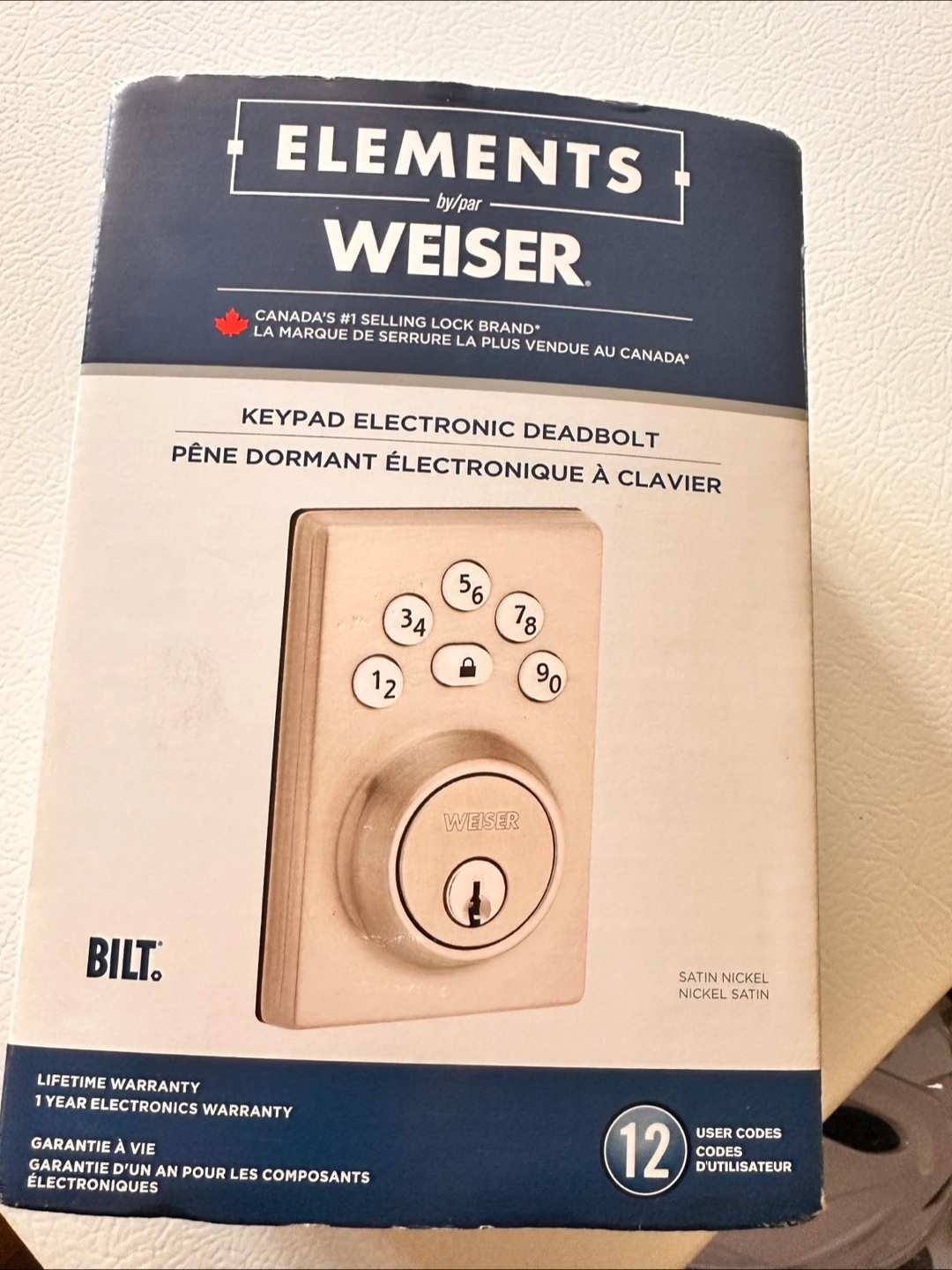 Selling a Weiser Elements keypad electronic deadbolt in satin nickel. It's brand new in the box and has never been used. Features a keypad for keyless entry and can store up to 12 user codes. Great for adding extra security to your home!