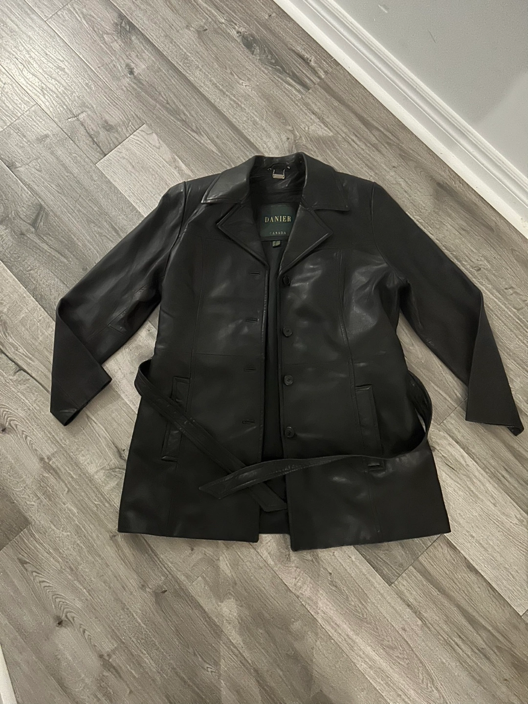 Selling a Women’s Danier leather jacket in size Large. It's a stylish black leather jacket with a belted waist. Great for fall!
