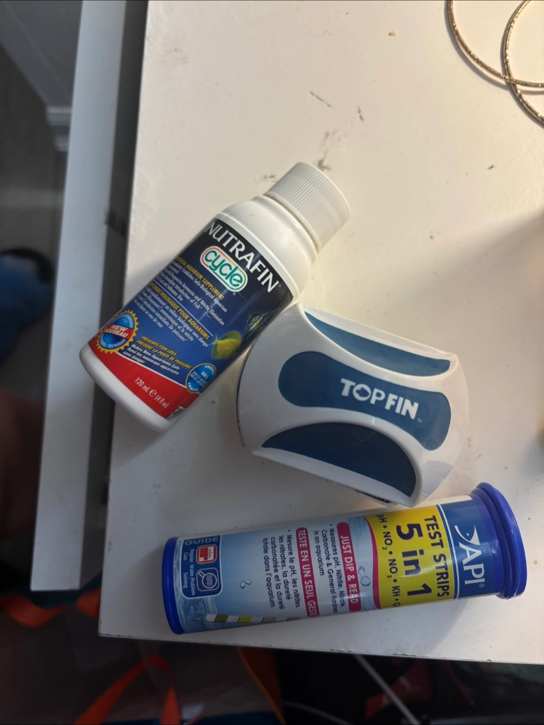 Includes a fish net, fish food,bucket, water testing strips API aquarium salt, gravel cleaner, glass cleaner and an automatic fish feeder.