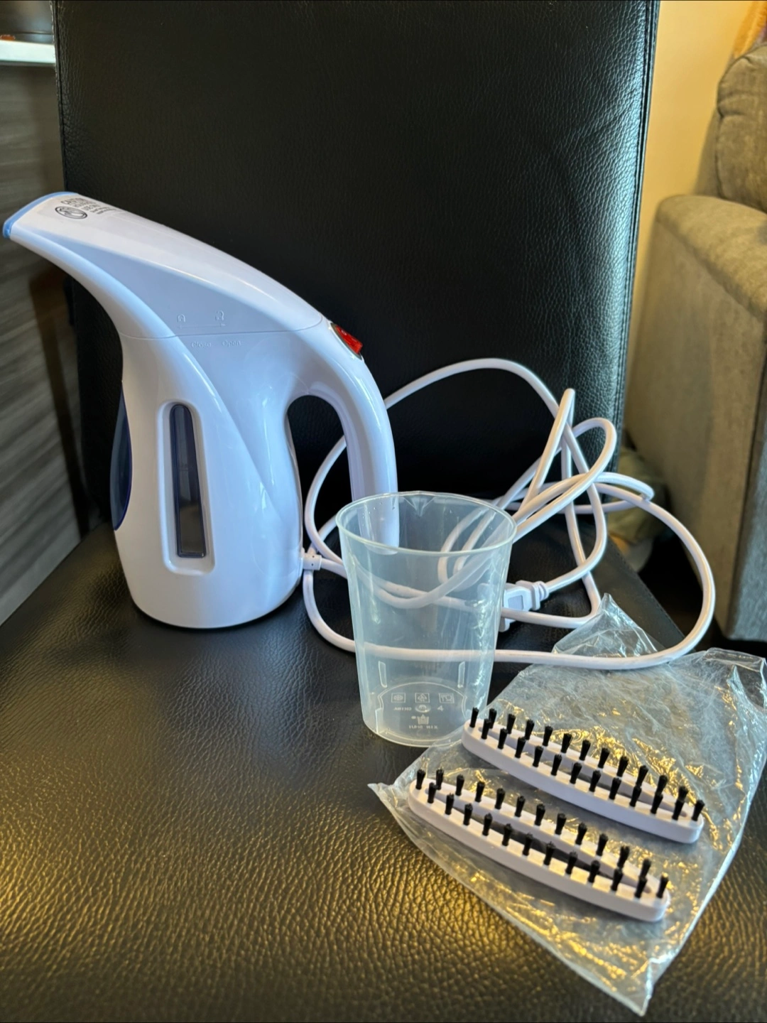 88Selling a handheld garment steamer in white and blue! It's in great condition and ready to use. Comes with a water cup and two brush attachments. Perfect for quick touch-ups and travel
