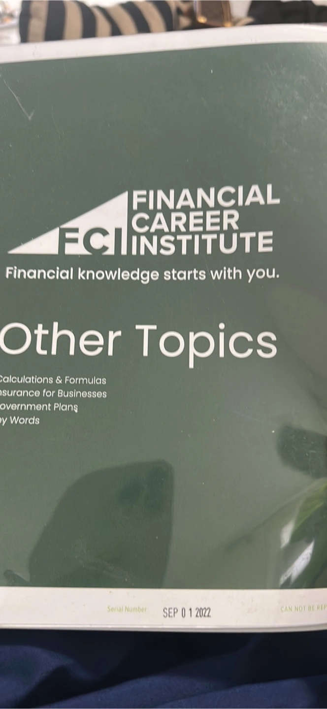 75Selling a Financial Career Institute book covering various topics such as calculations and formulas, insurance for businesses, government plans, and key words