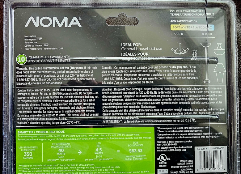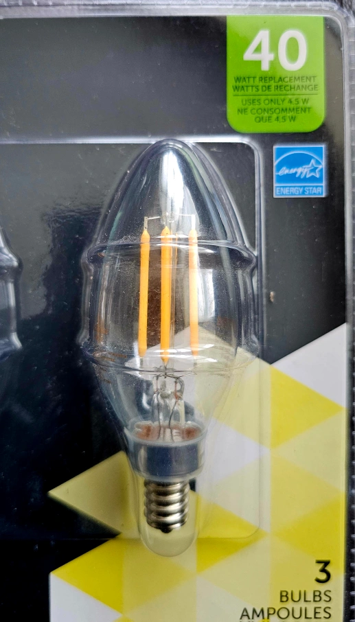 Here's a pack of three Noma LED candelabra base B11 bulbs! They're soft white. These bulbs are dimmable and use 88% less energy. They also last for 13.7 years. Each bulb uses 4.5 watts and has a light output of 350 lumens. The packet was opened and one bulb tried on; however it didn't fit. So they're new.