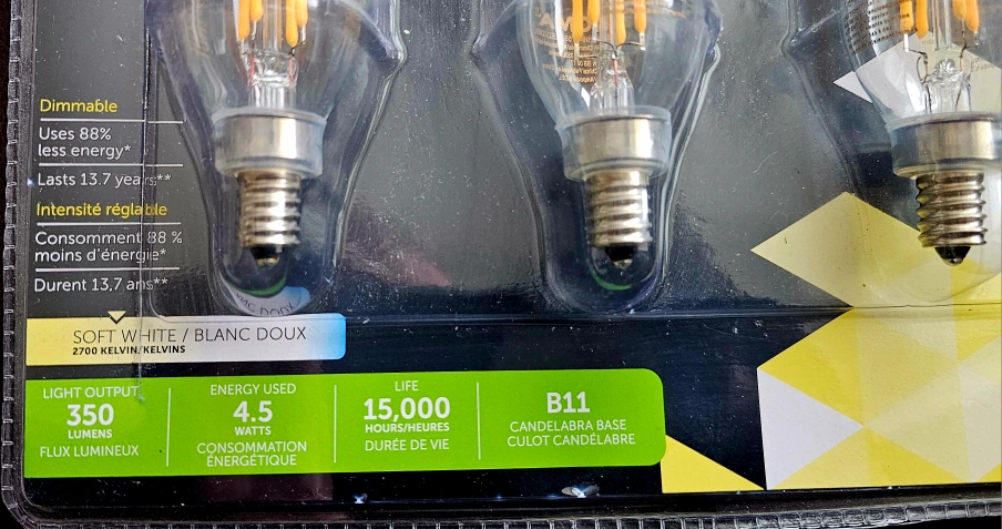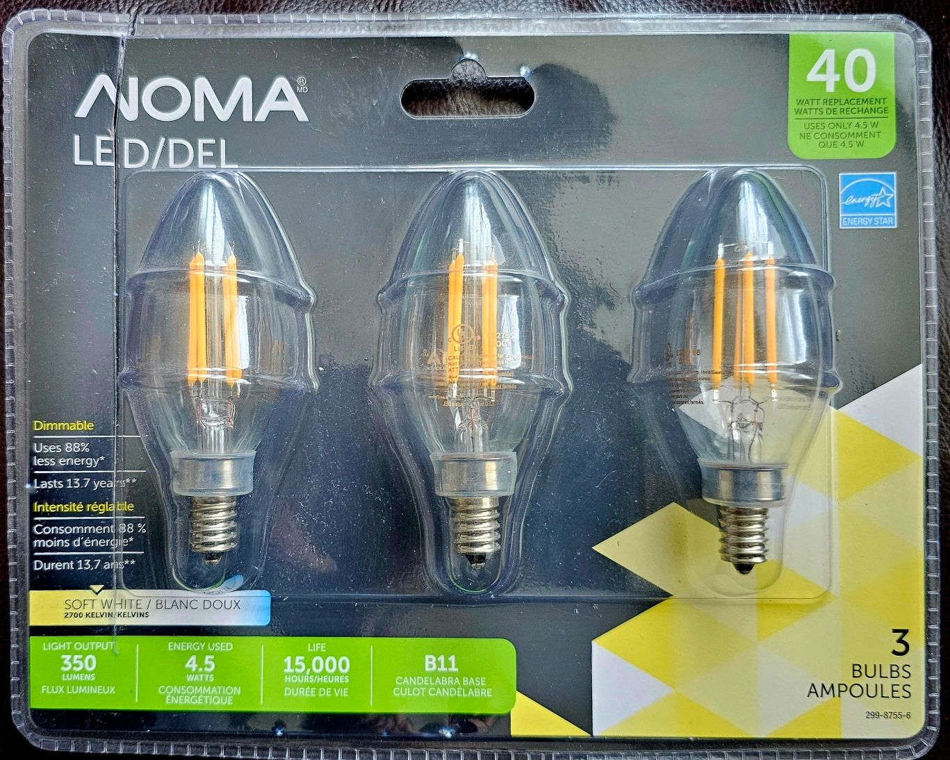 Here's a pack of three Noma LED candelabra base B11 bulbs! They're soft white. These bulbs are dimmable and use 88% less energy. They also last for 13.7 years. Each bulb uses 4.5 watts and has a light output of 350 lumens. The packet was opened and one bulb tried on; however it didn't fit. So they're new.