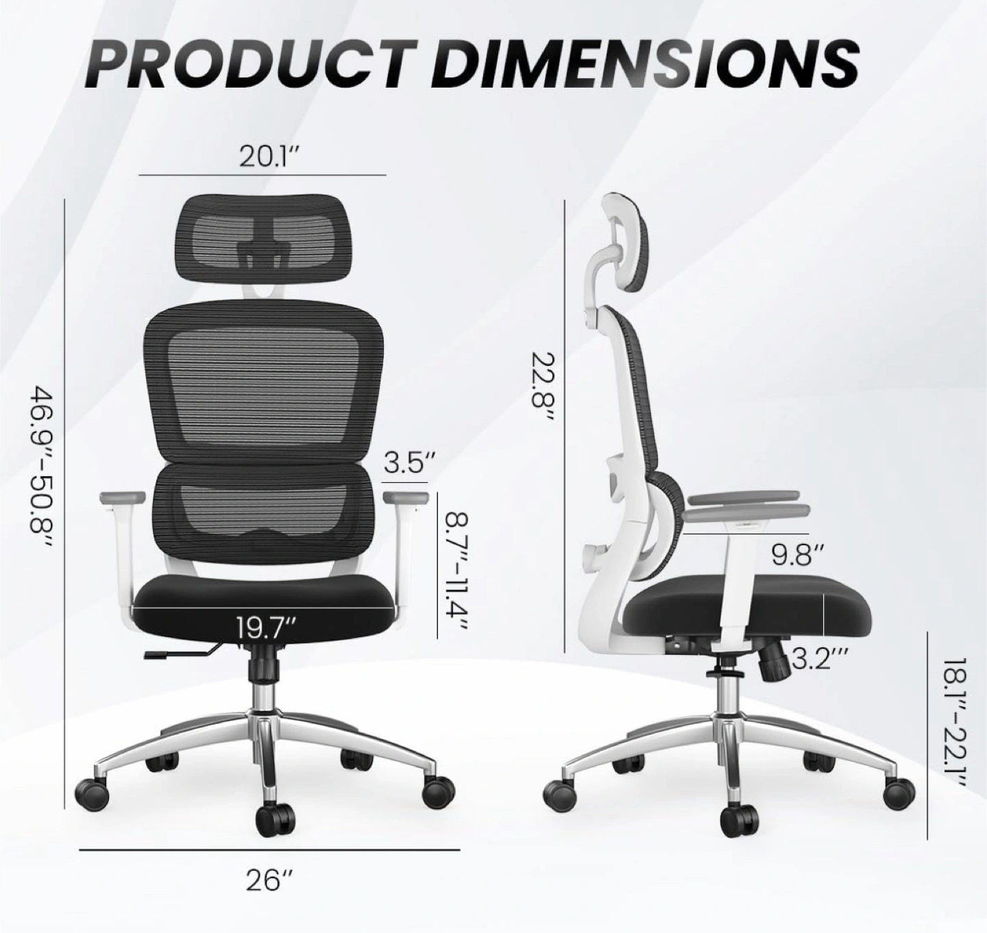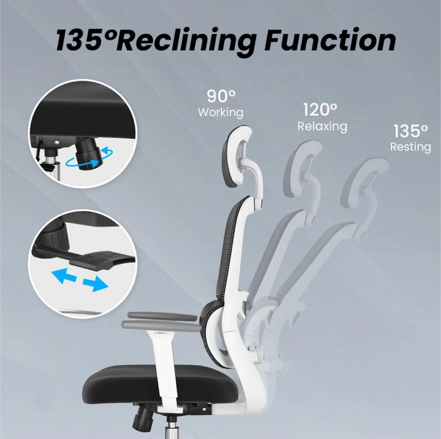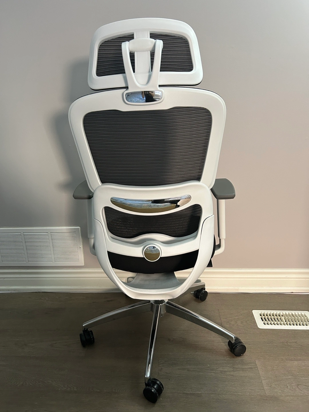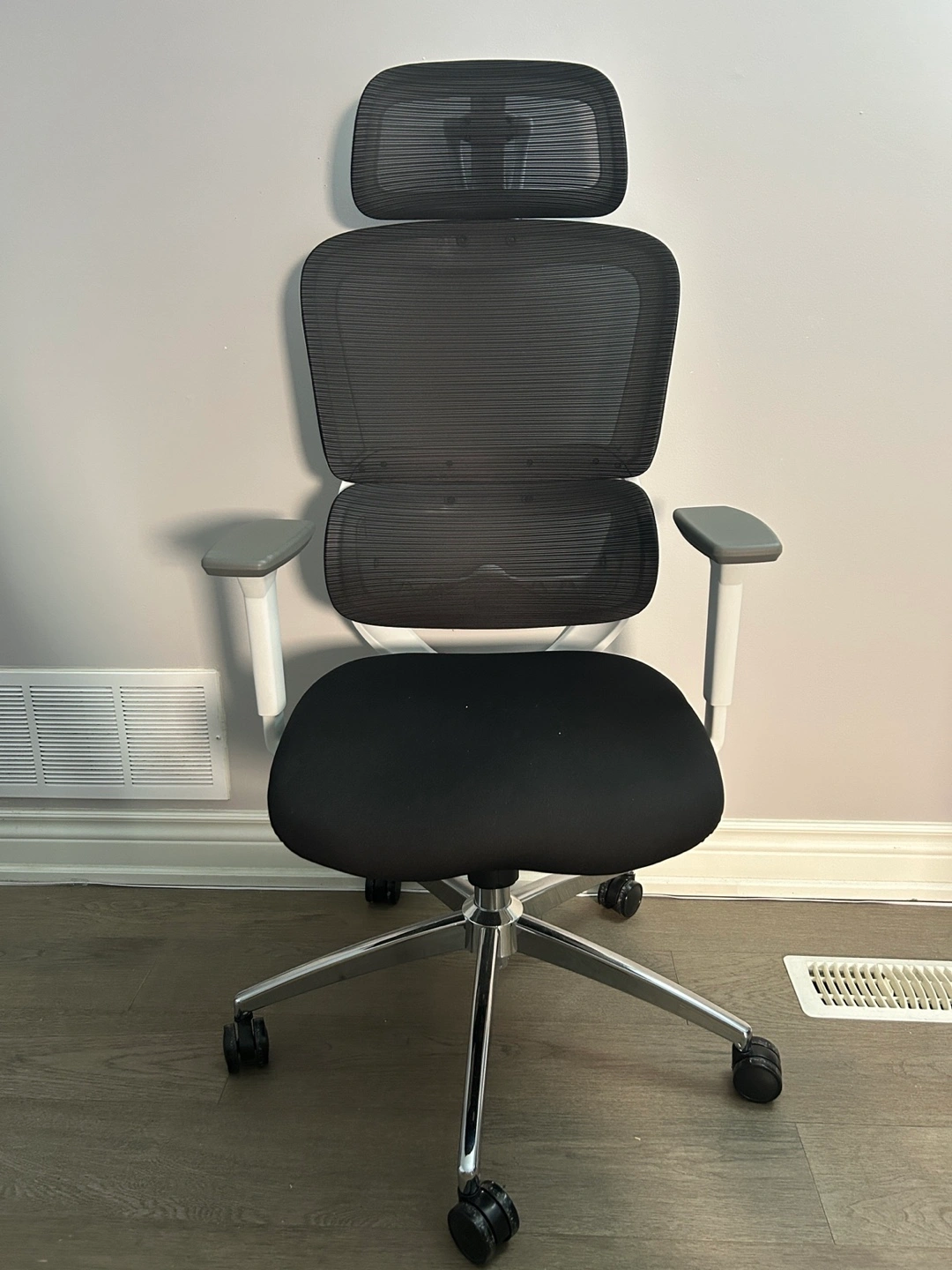 Selling a comfortable ergonomic office chair! It features a black mesh back and seat with a white frame. The chair includes a headrest and adjustable armrests for personalized support. The back support is also adjustable. Great for long hours at your desk!