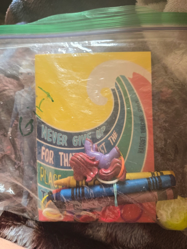 I'm selling a fun little activity set for kids! It includes a card with a motivational design, a few crayons, and some other small trinkets, all bundled together in a plastic bag. Perfect for keeping the little ones entertained!