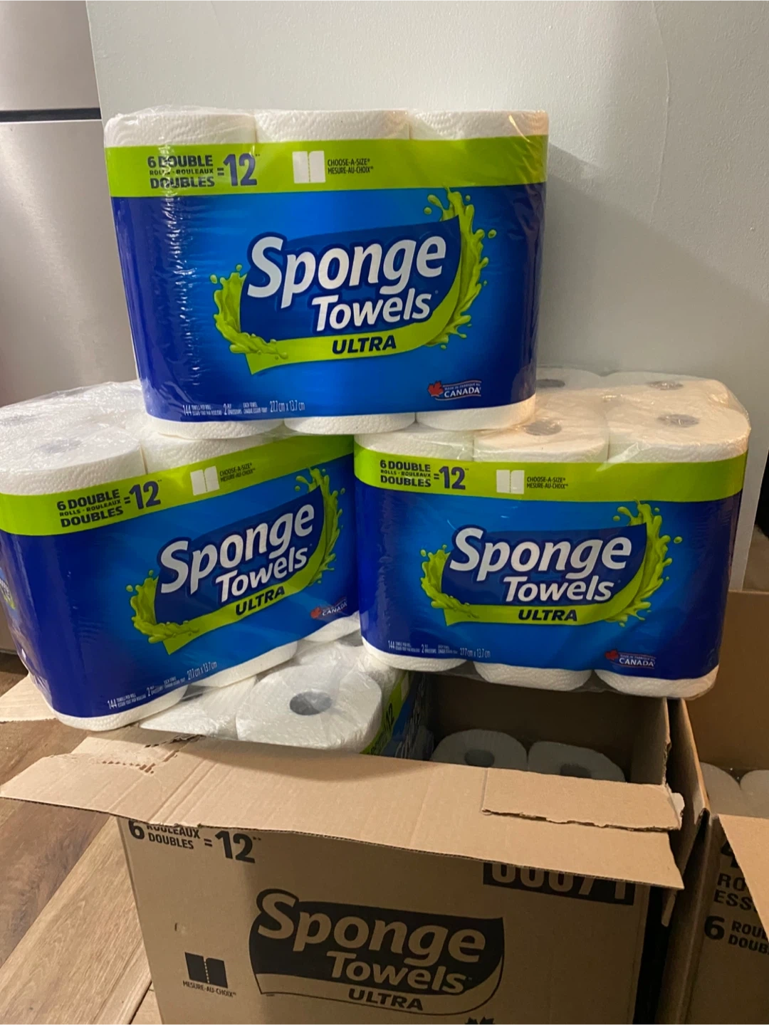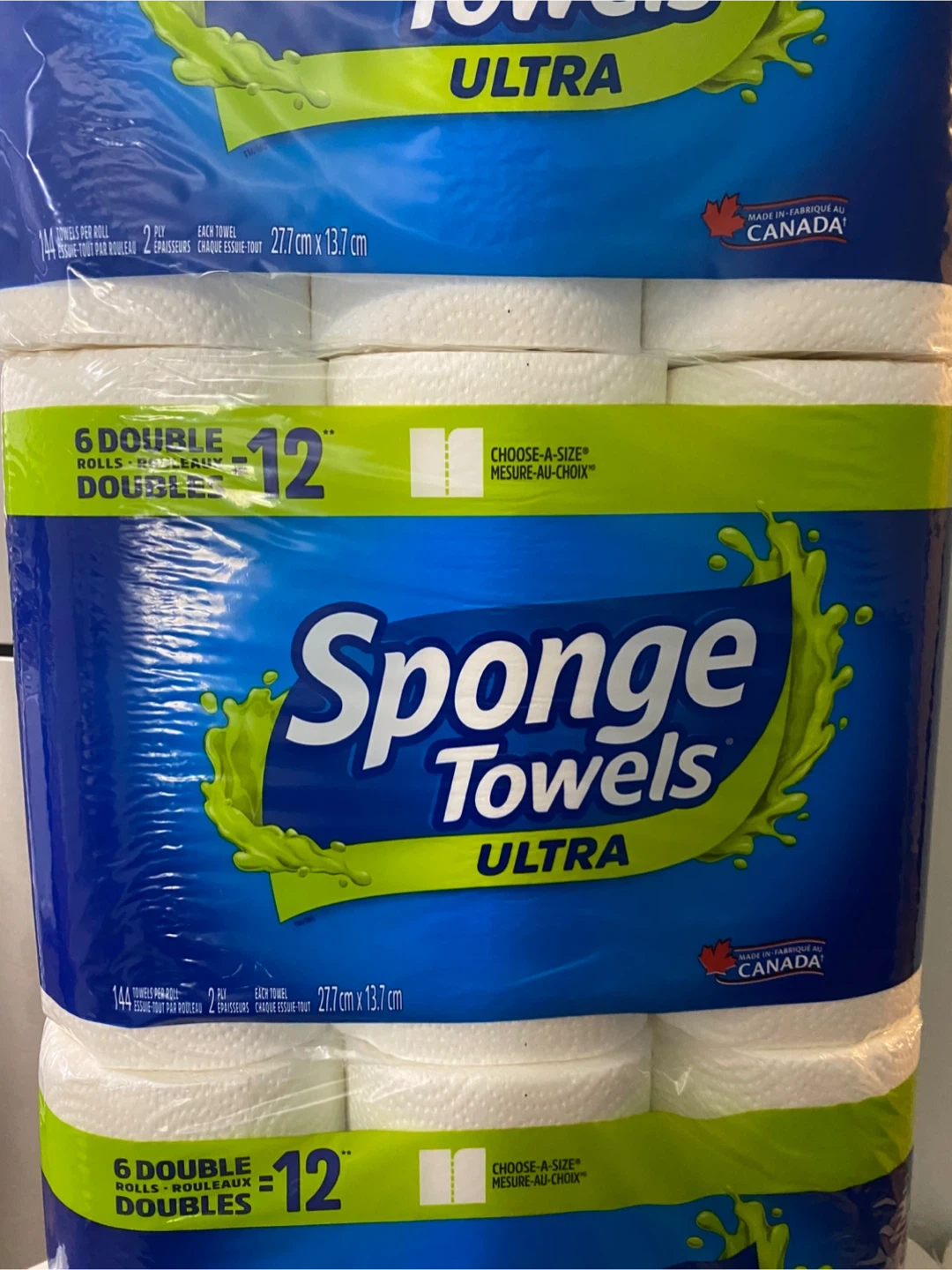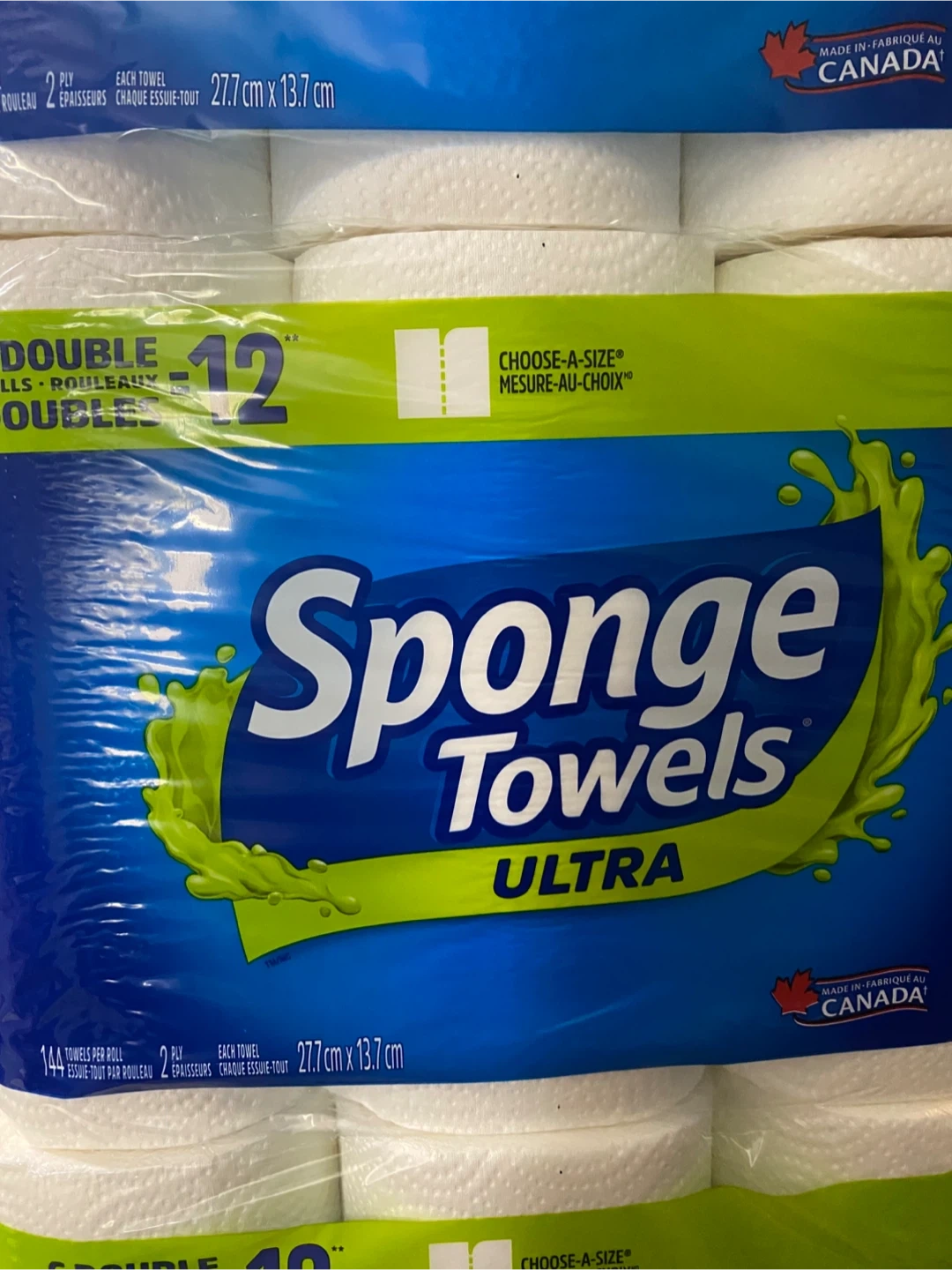 Sponge Towels Ultra with 6 double rolls. Each towel measures 27.7 cm x 13.7 cm and is 2 ply. Made in Canada. These are strong and absorbent sponge towels for kitchen use.