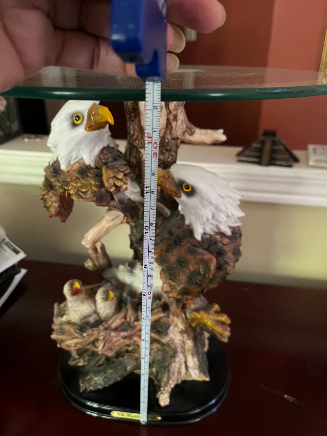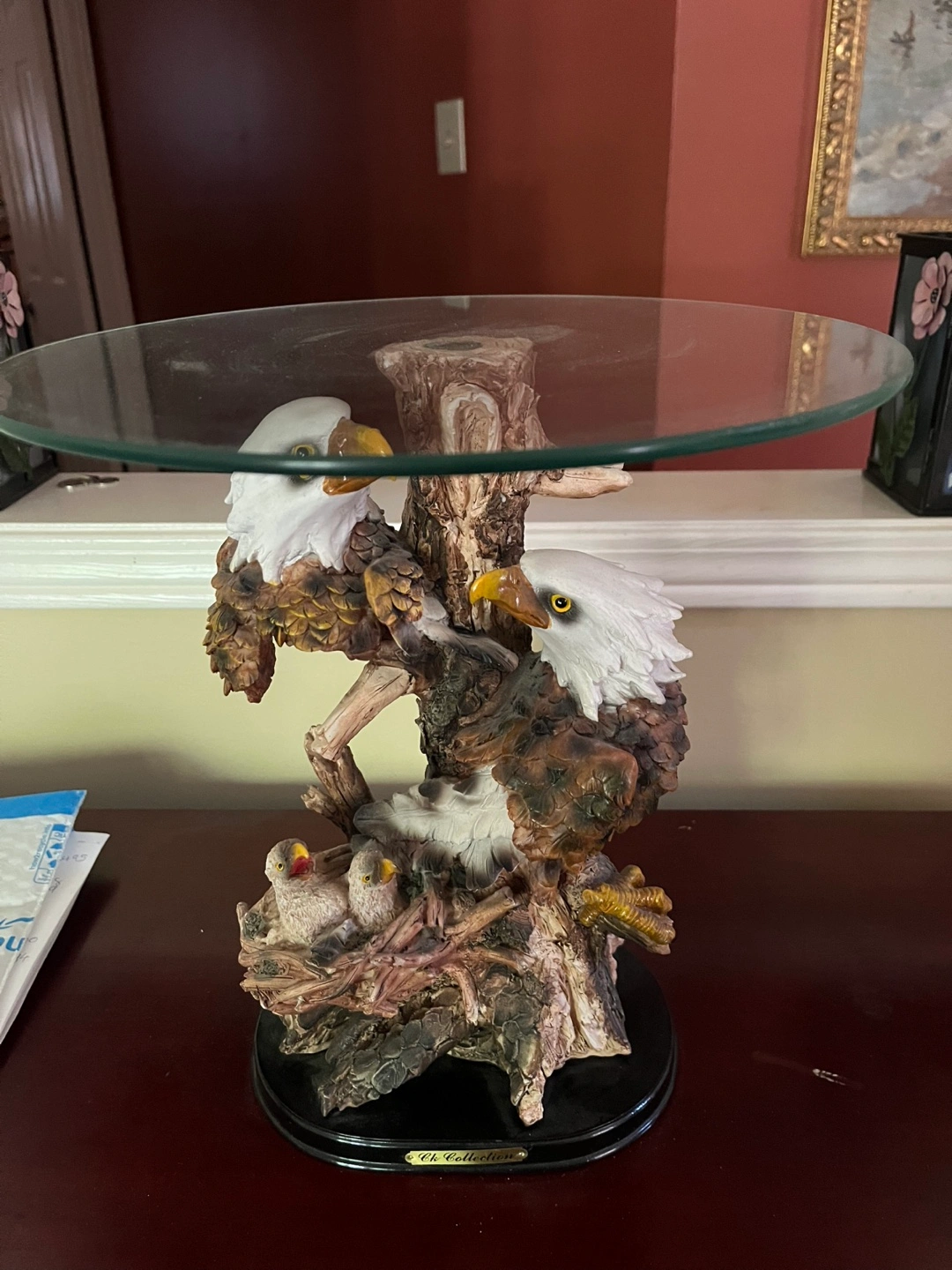 This unique accent table features an eagle sculpture base with a glass top. It would make a great addition to any room!