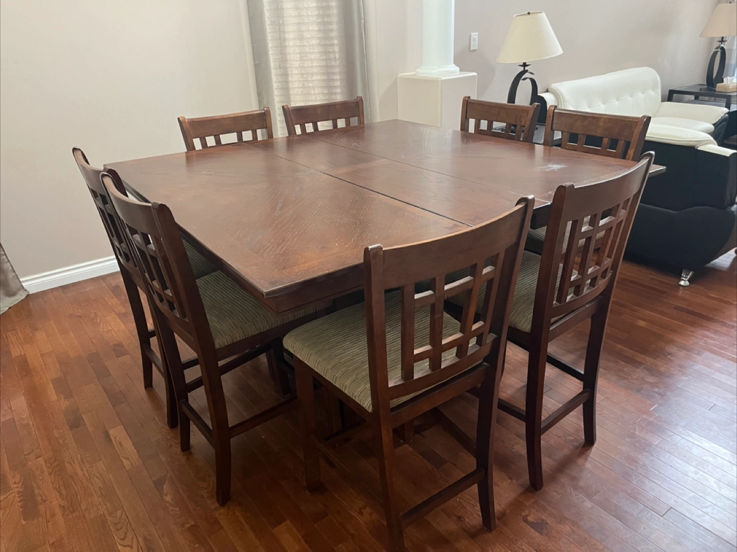 Selling a dining table set that includes 8 chairs. The table is a dark brown wood, and the chairs have a patterned fabric seat. It's a great set for a large family or for hosting dinner parties!