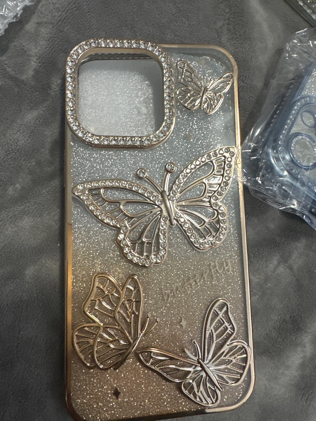 75Selling a super cute phone case with a butterfly design and rhinestone accents! It has a clear base with silver glitter and various butterfly embellishments. Perfect for adding a bit of sparkle to your phone!