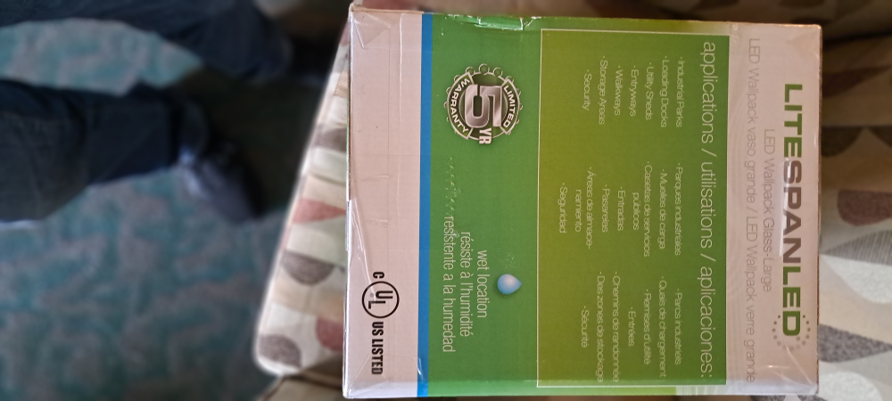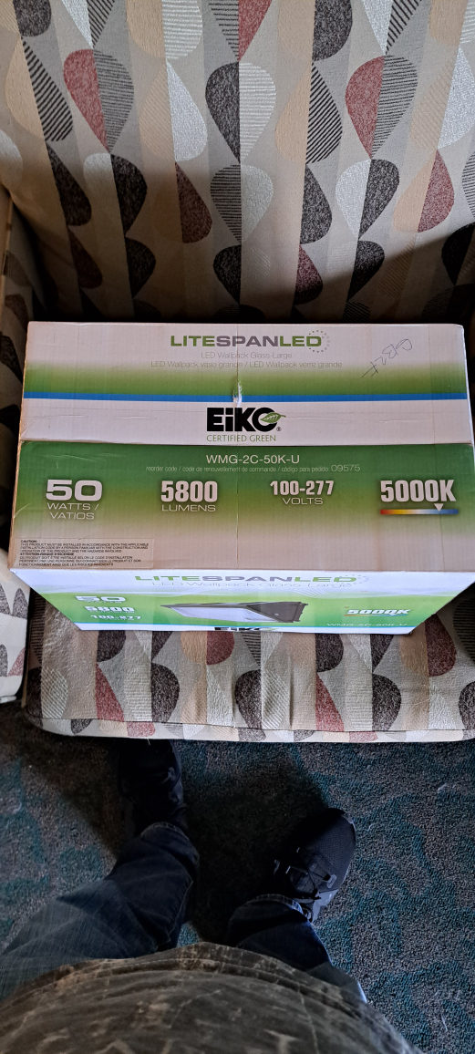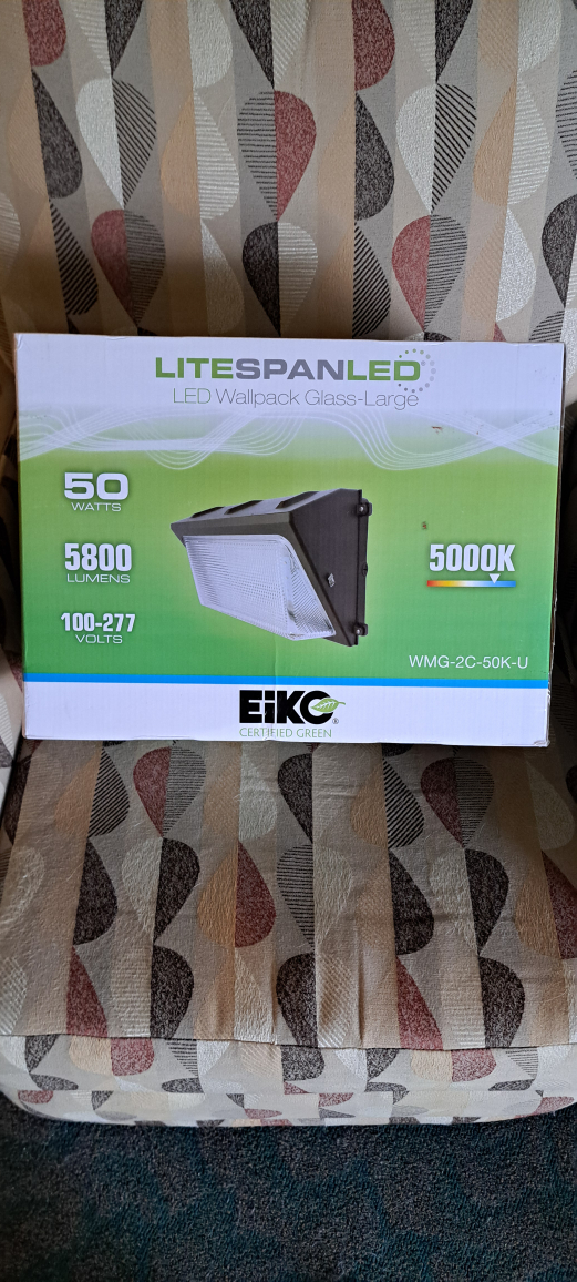Selling a new Eiko LitespanLED Wallpack Glass-Large. It's 50 watts, 5800 lumens, and 100-277 volts. The colour temperature is 5000K. It's designed for wet locations and has a 5-year limited warranty. Great for industrial parks, loading docks, entryways, and security areas. Box included