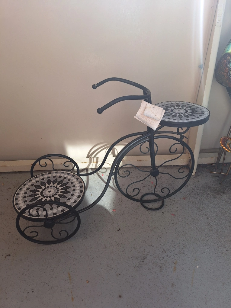 This is a really cute decorative plant stand shaped like a bicycle! It has two platforms with a mosaic design. A fun way to display your plants