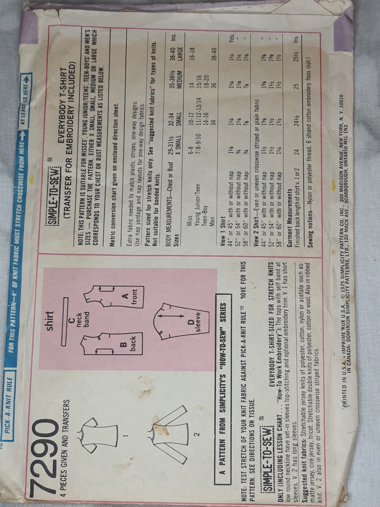 I'm selling a vintage Simplicity sewing pattern, number 7290! This pattern is for making T-shirts and includes a transfer for embroidery. It's sized for stretch knits only and comes in a medium size. Great for sewing enthusiasts!