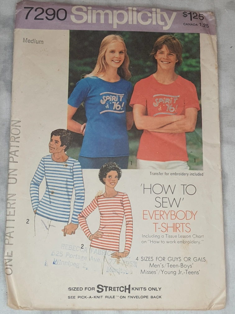 I'm selling a vintage Simplicity sewing pattern, number 7290! This pattern is for making T-shirts and includes a transfer for embroidery. It's sized for stretch knits only and comes in a medium size. Great for sewing enthusiasts!