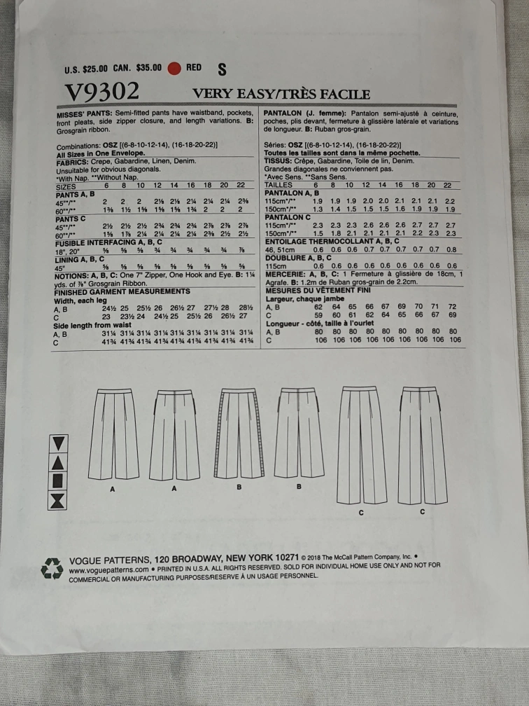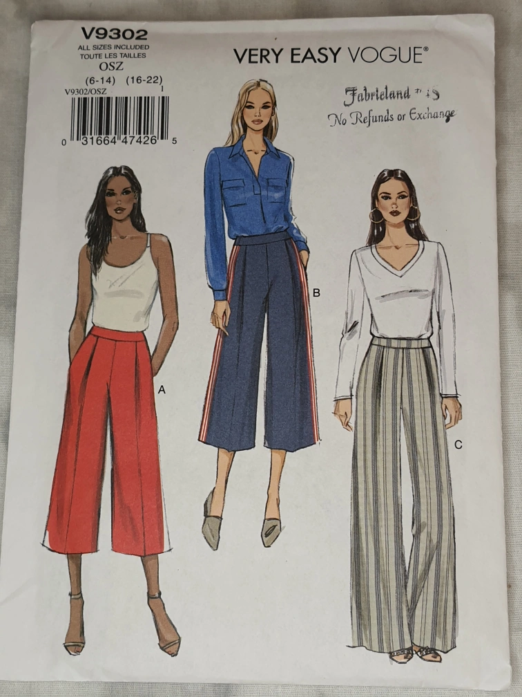 Get ready to sew some stylish pants with this Very Easy Vogue pattern, V9302! This pattern includes sizes OSZ (16-22). Perfect for creating semi-fitted pants with waistbands, pockets, pleats, and more. A great project for your next sewing adventure!