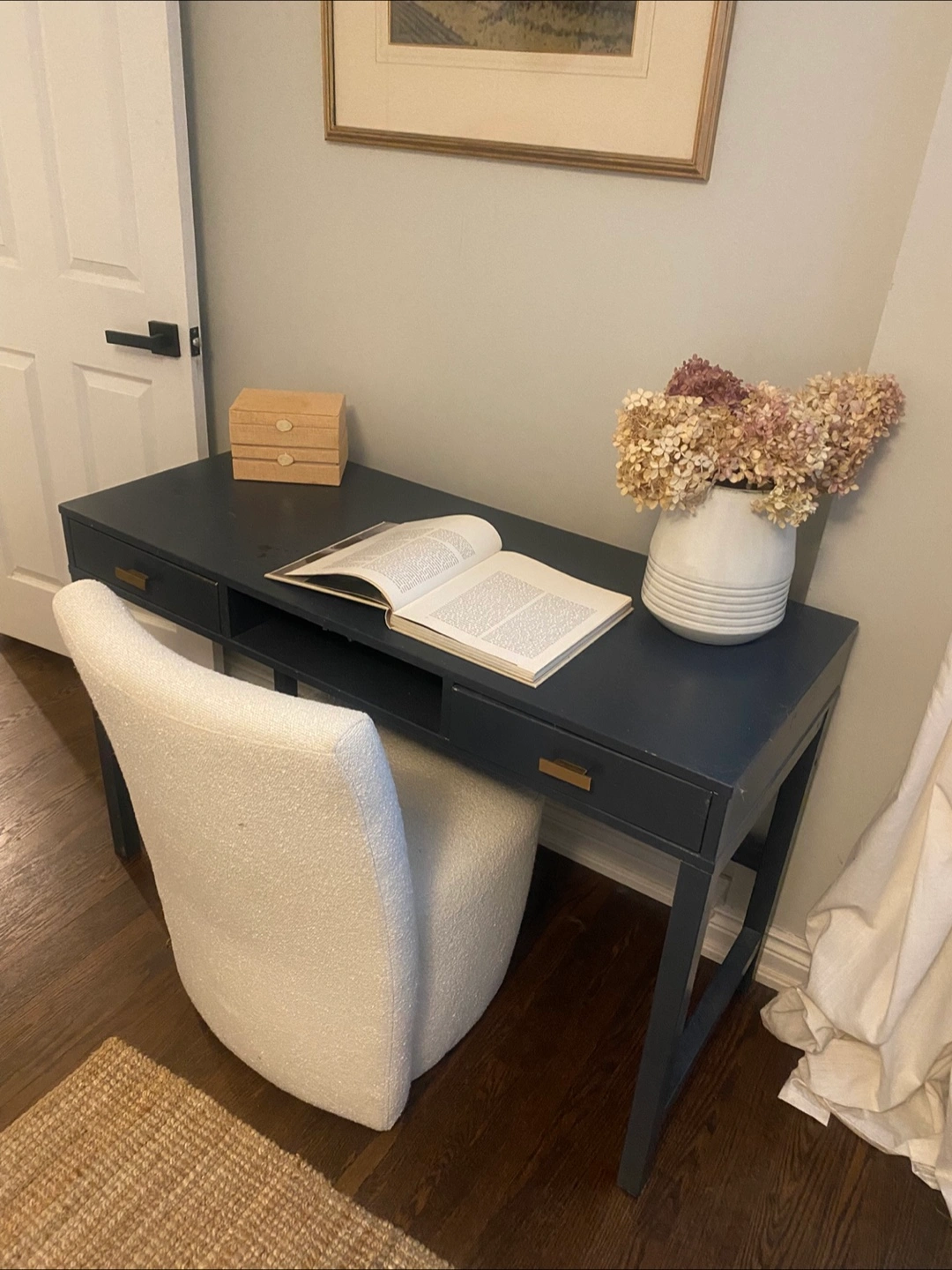 Selling a dark blue wooden desk. It has a simple, classic design with two drawers and a shelf in the middle. Perfect for a home office or study nook!