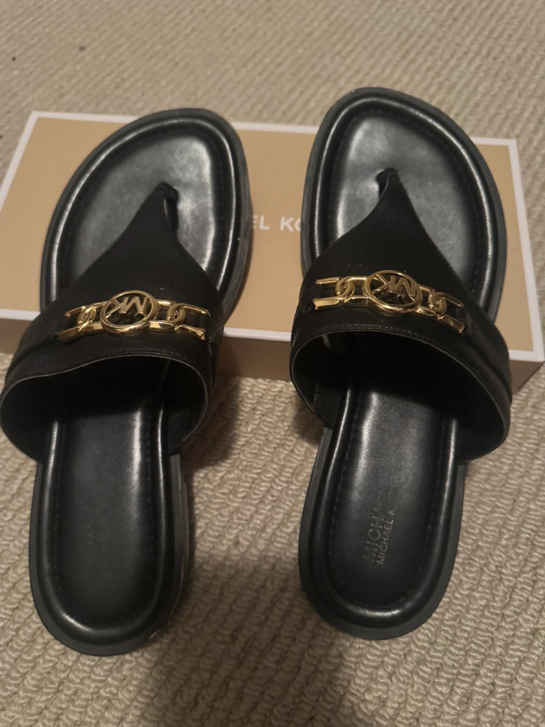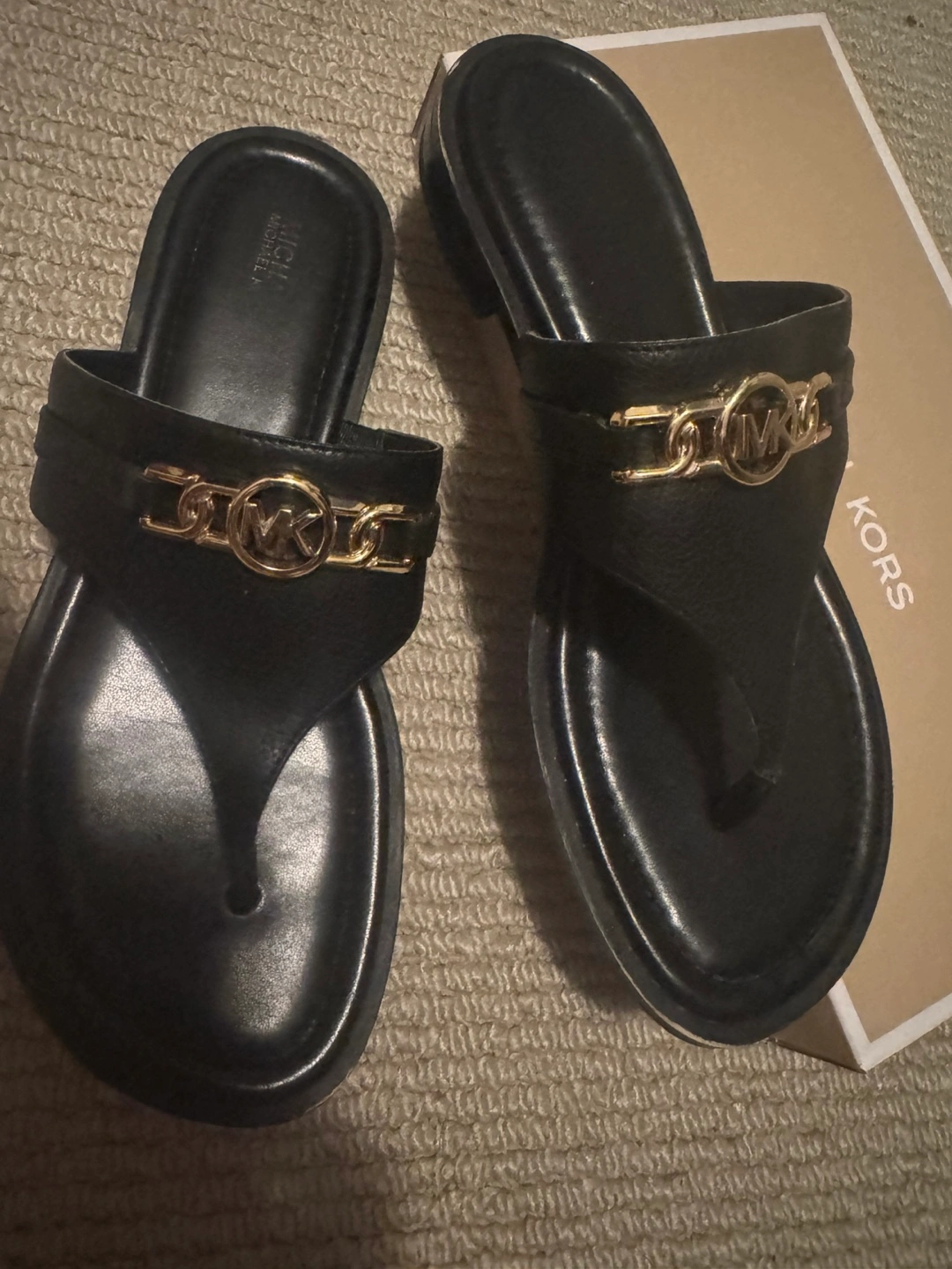 These are a pair of Michael Kors black thong sandals. They feature a gold chain detail with the MK logo. They come in size 8 and include the original box.