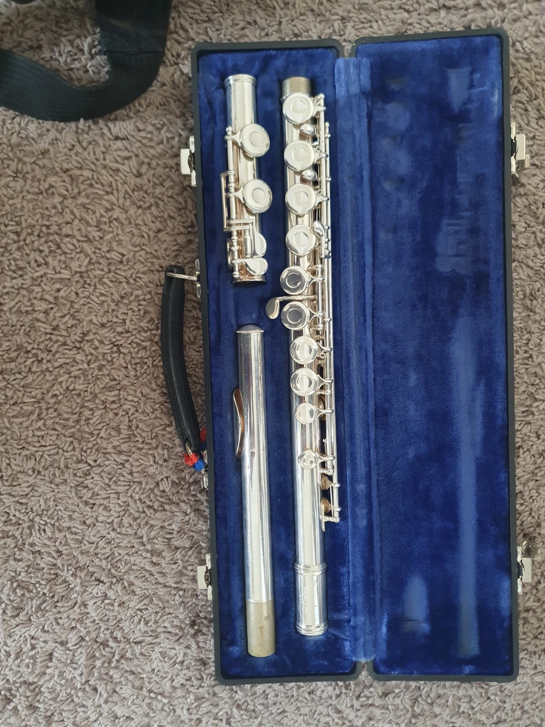 Silver-tone flute in a blue velvet-lined hard case. Perfect for beginners or as a practice instrument! It is a bit used and with black case to walk with it.