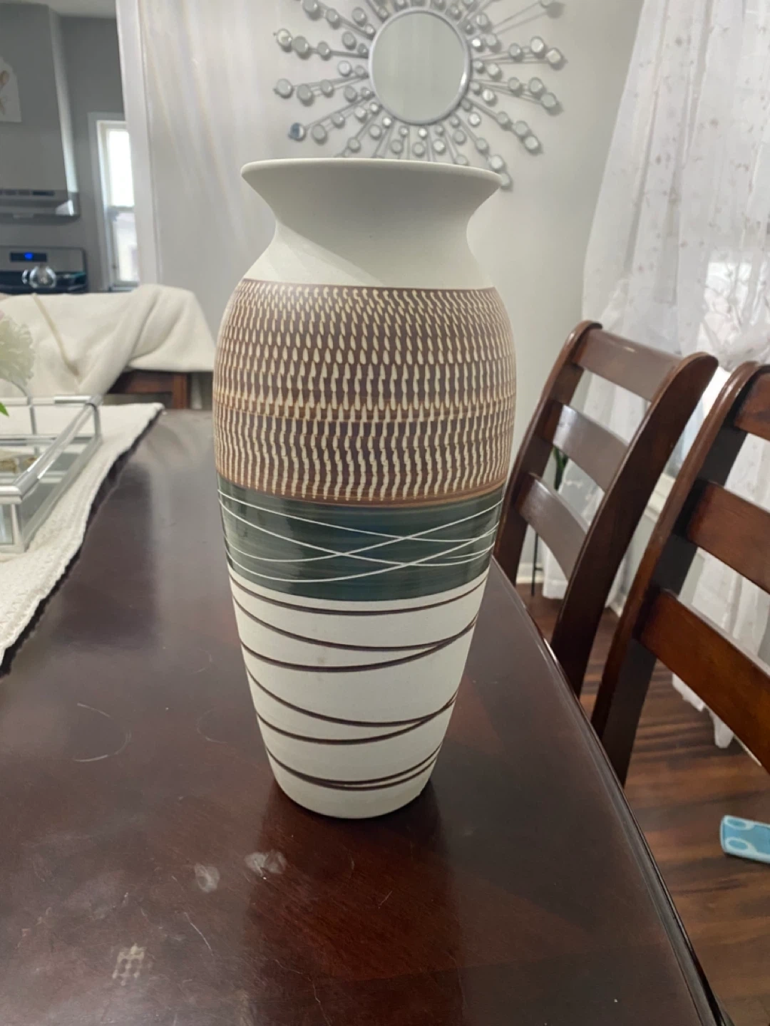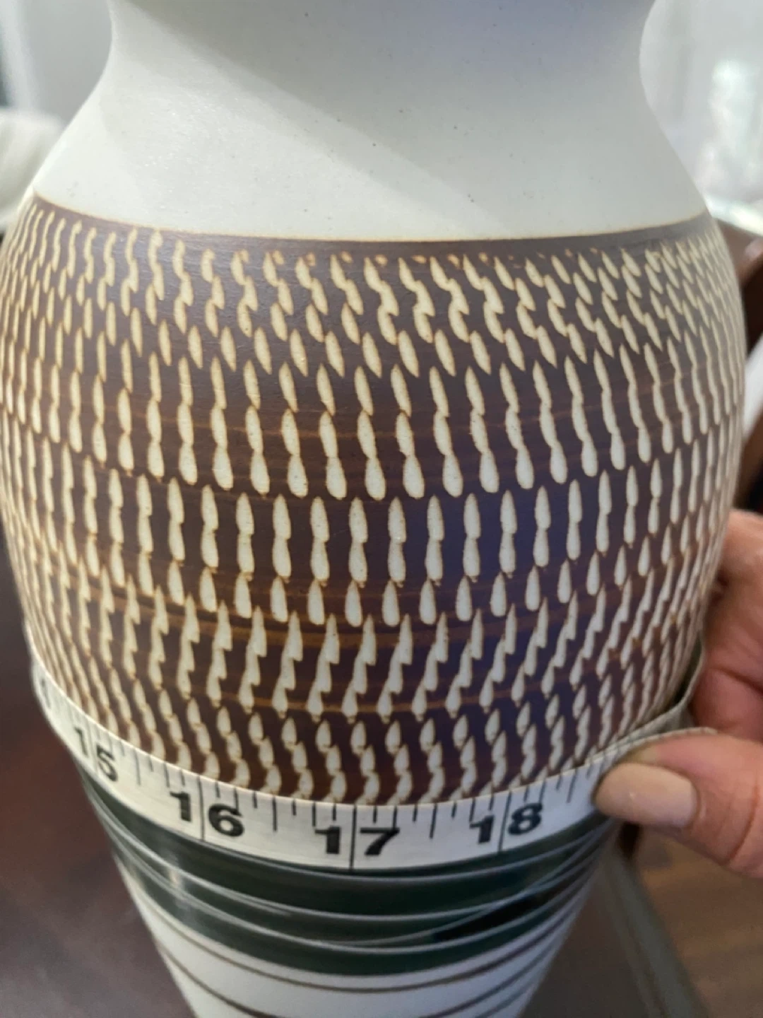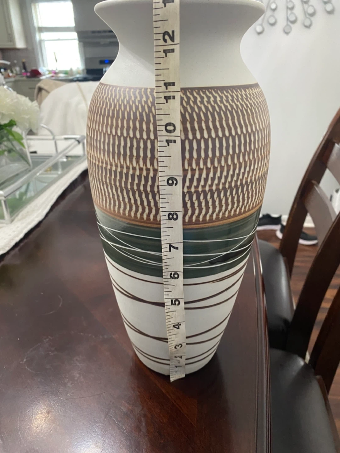 This is a decorative vase with a unique patterned design. It's approximately 13 inches tall and 5.5 inches wide at its widest point. This vase would make a nice accent piece for any room!