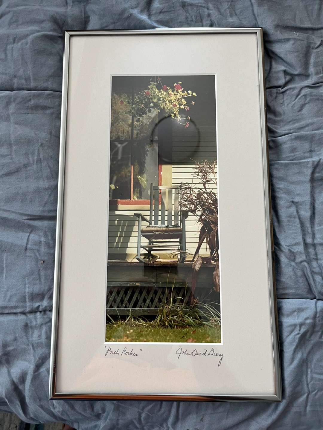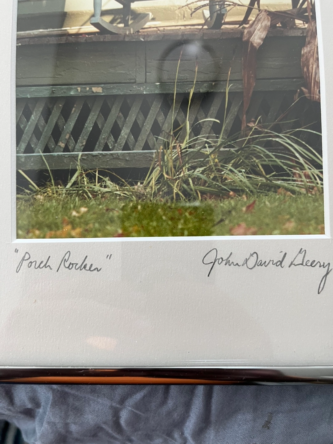 Selling a framed photograph titled "Porch Rocker" by John David Gerry. He’s a renowned photographer specializing in New England scenery. It's a lovely unique piece that would look great in any home. The frame is in good condition and ready to hang!