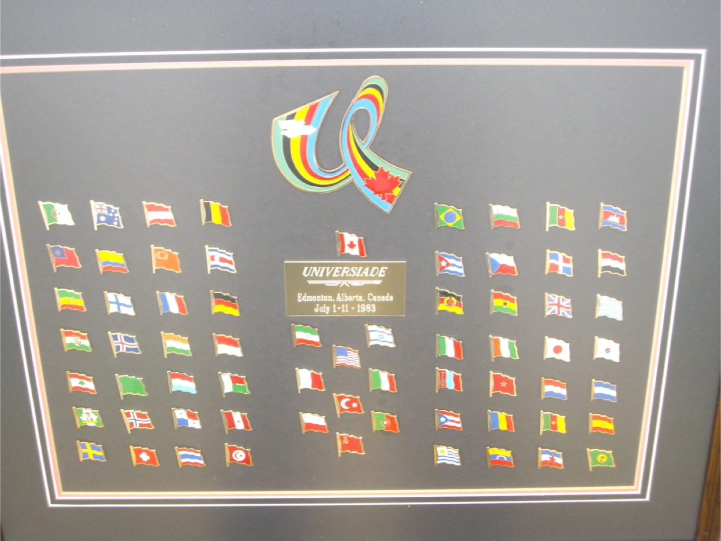 Selling a framed pin collection from the Universiade games held in Edmonton, Alberta, Canada, July 1-11, 1983. It's a great piece of memorabilia!