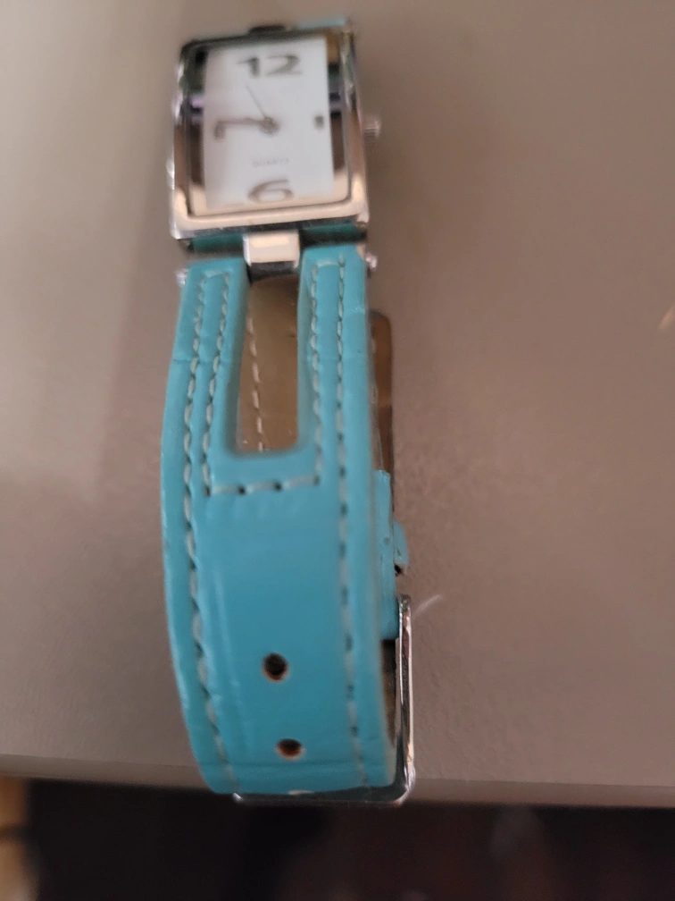 Selling a ladies' quartz watch with a unique turquoise band. The watch face is rectangular and features the numbers 12 and 6. It's in good condition and ready to wear!