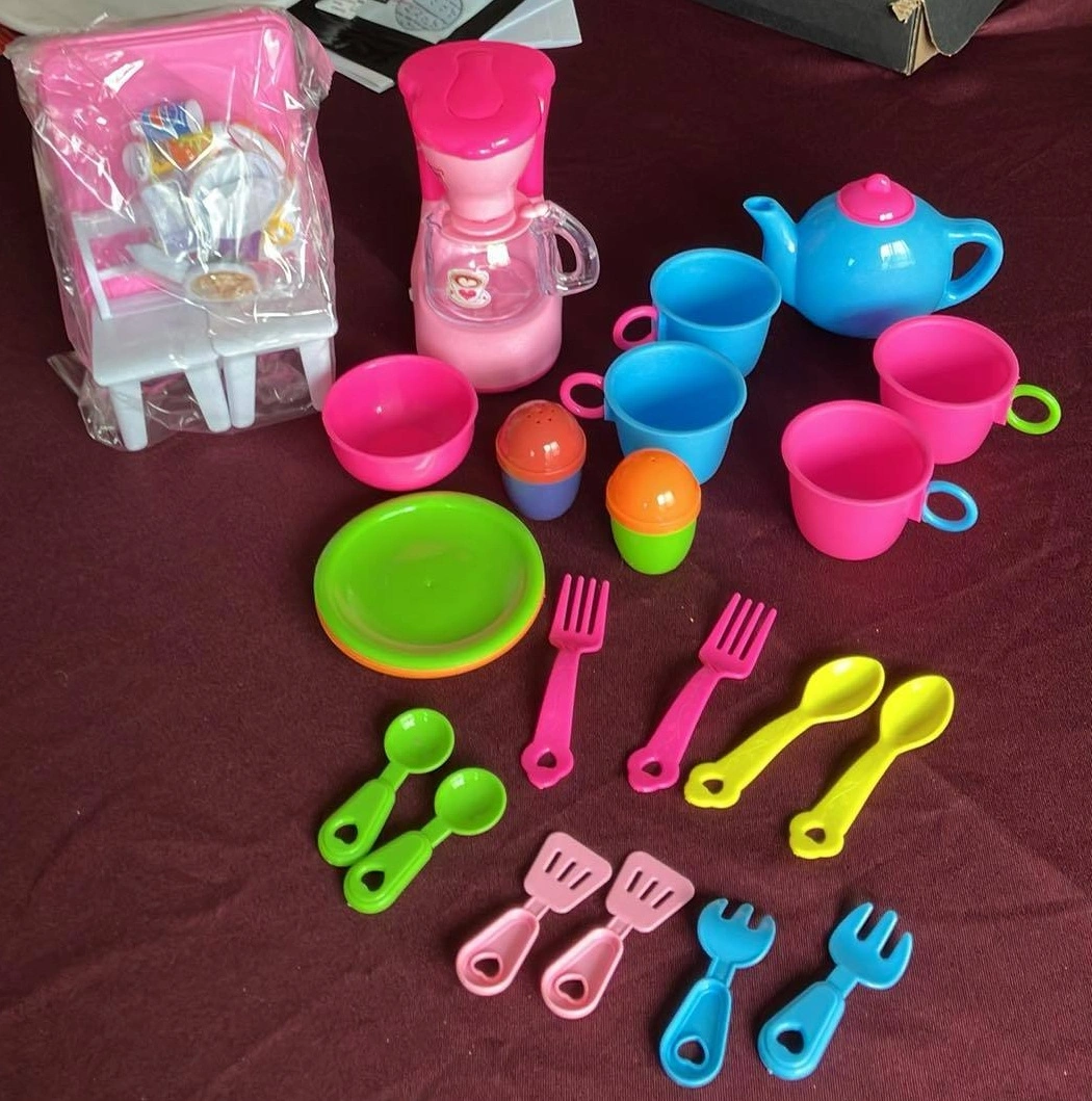 Tea Set, salt and pepper shakers, cups, spoons, coffee machine, table chairs and accessaries