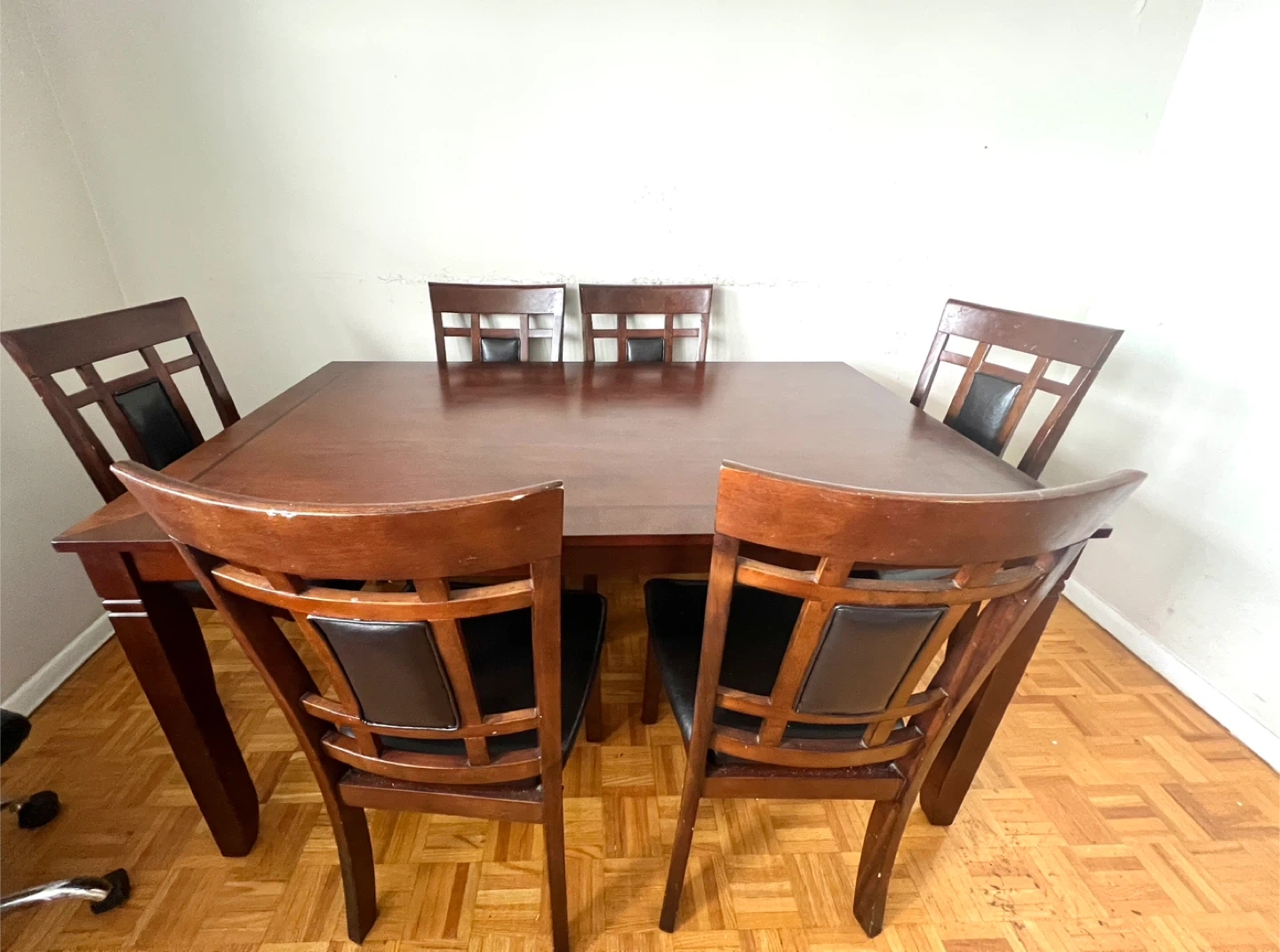 Made of solid wood, sturdy and durable. Modern, elegant design that fits well in any dining space. The table is always covered with a tablecloth, so it looks almost new. Chairs are well maintained and in great shape.