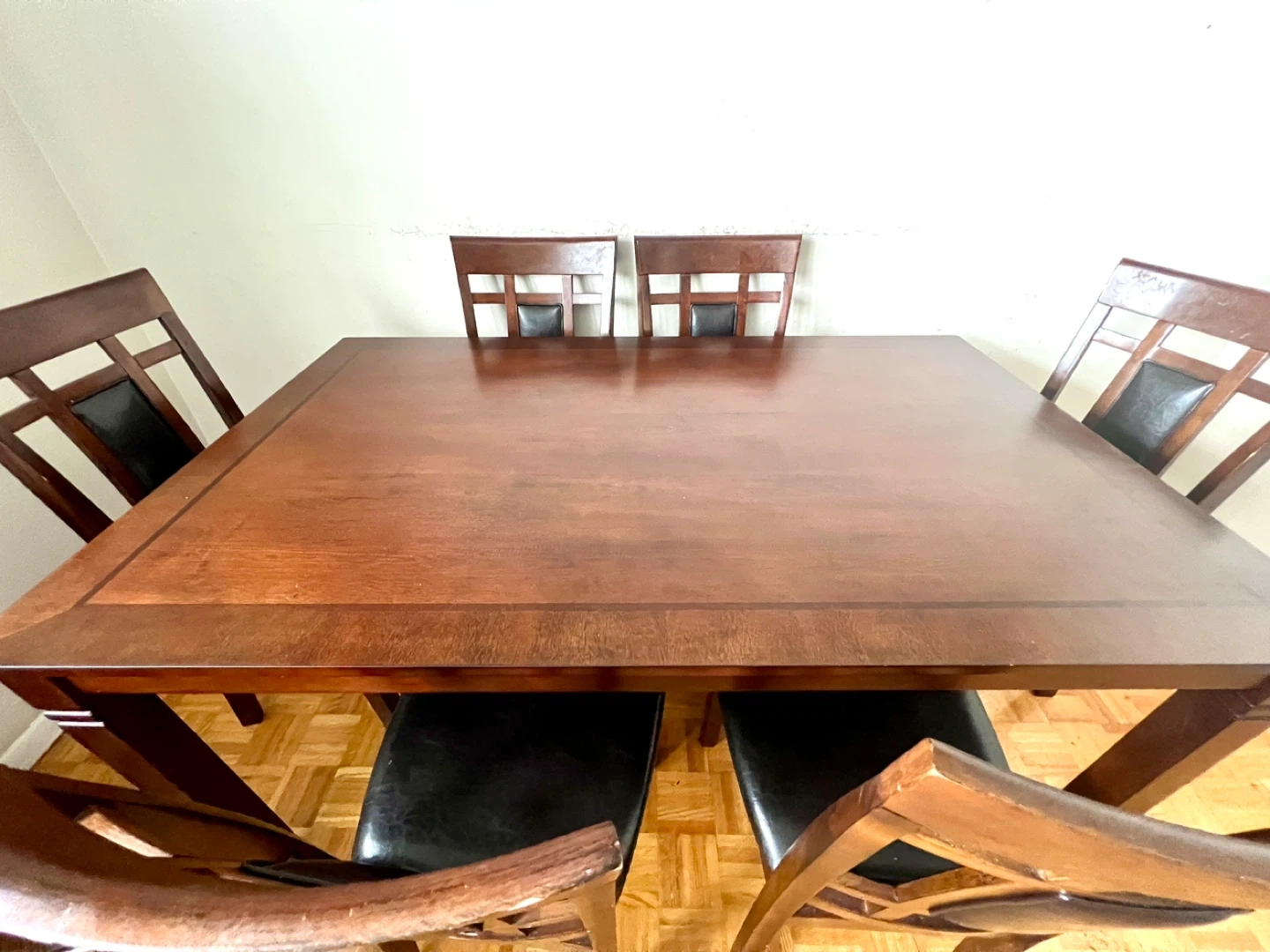 Made of solid wood, sturdy and durable. Modern, elegant design that fits well in any dining space. The table is always covered with a tablecloth, so it looks almost new. Chairs are well maintained and in great shape.