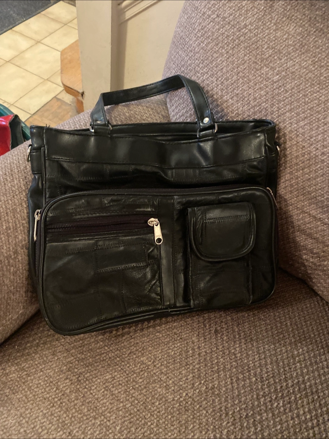 A classic black leather handbag, perfect for everyday use! It features a convenient front pocket and sturdy handles. It's in great condition and ready for a new home