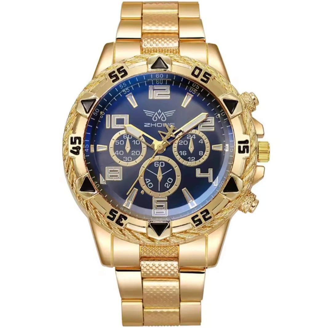 Check out this stylish ZHOWE watch! It features a striking gold finish with a blue chronograph dial. A great accessory to add some flair to your look!