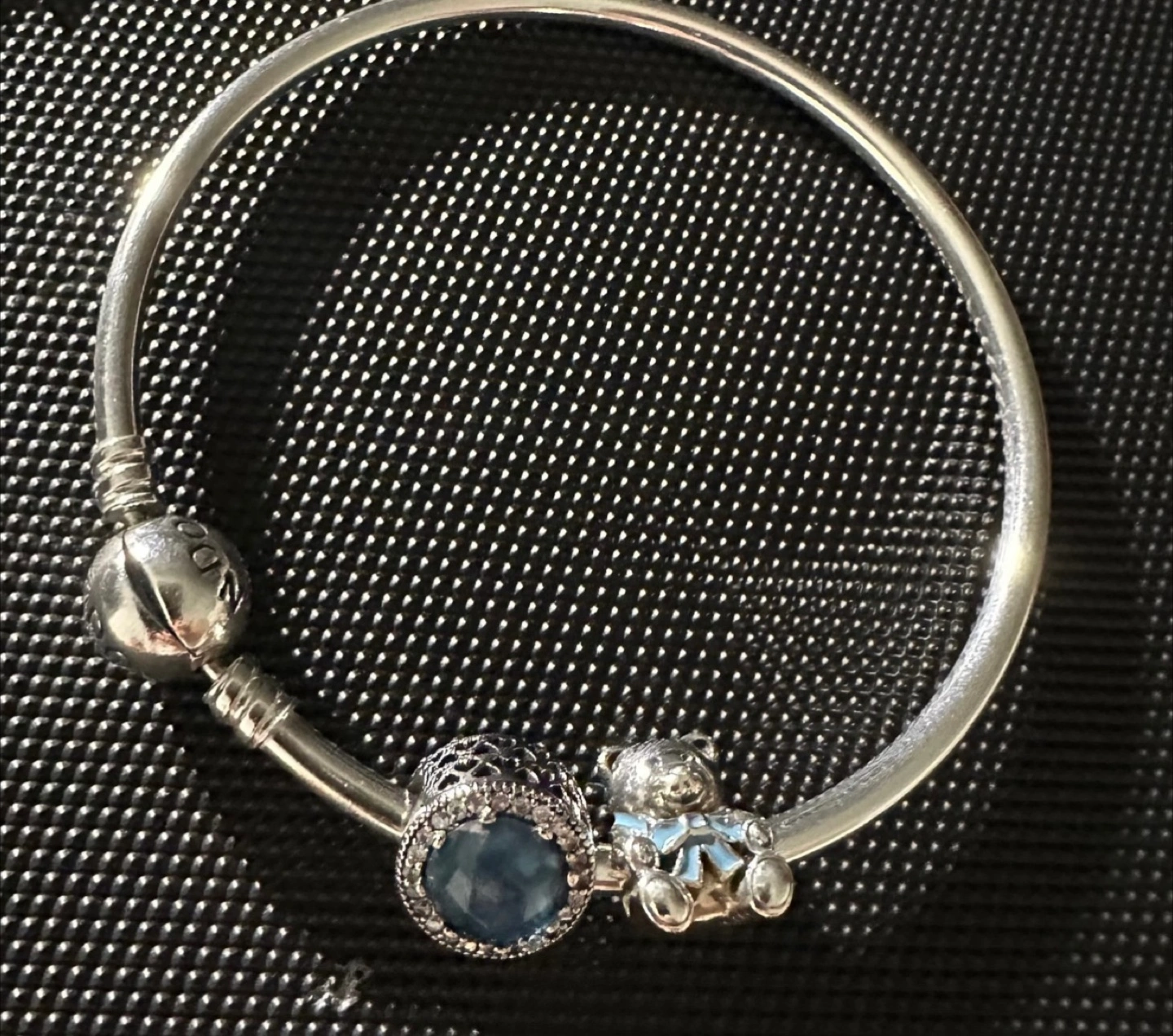 Selling a Pandora silver bangle bracelet. It comes with a few charms, including a teddy bear and a blue stone charm. It's in great condition and ready for a new home!