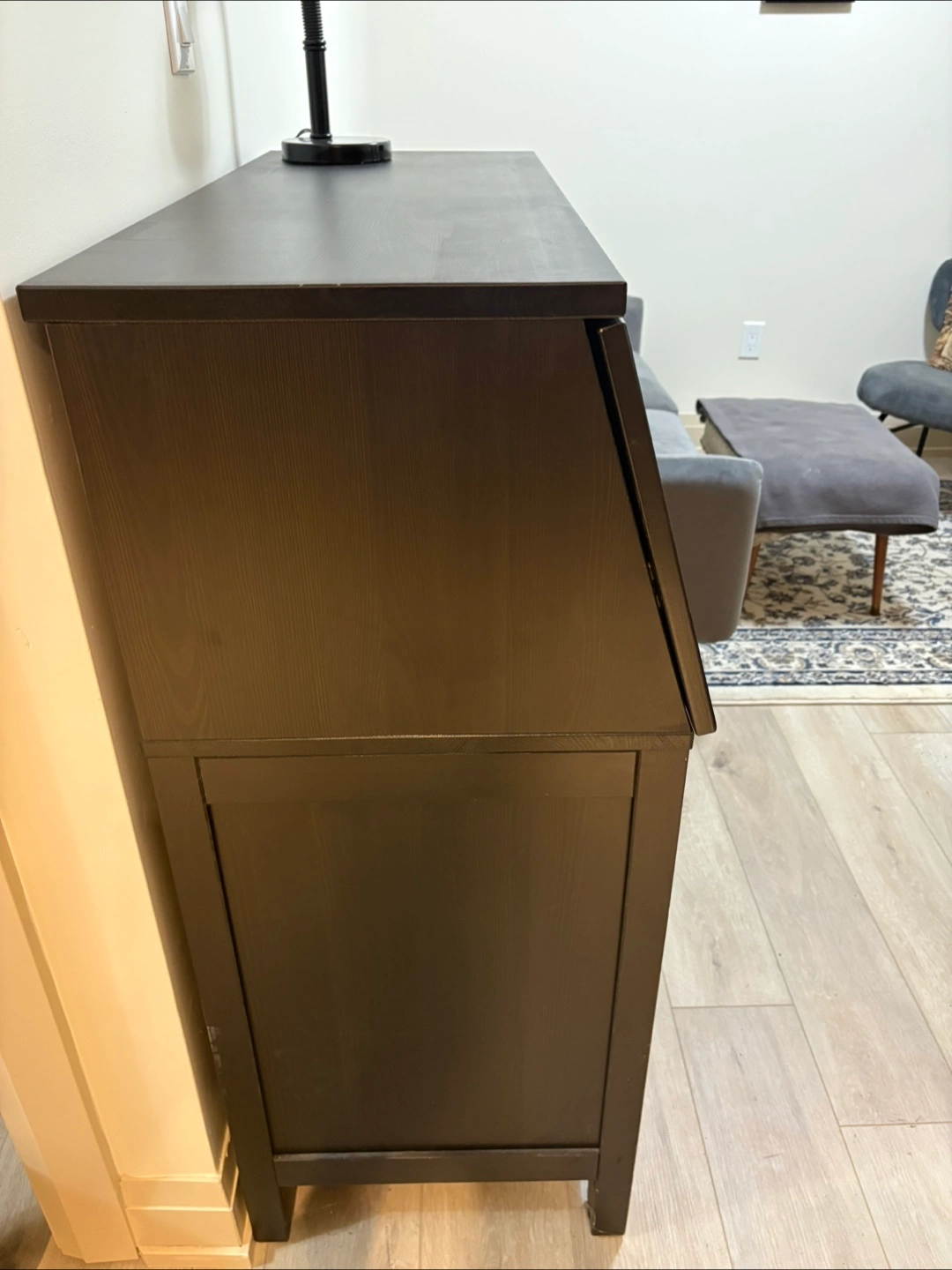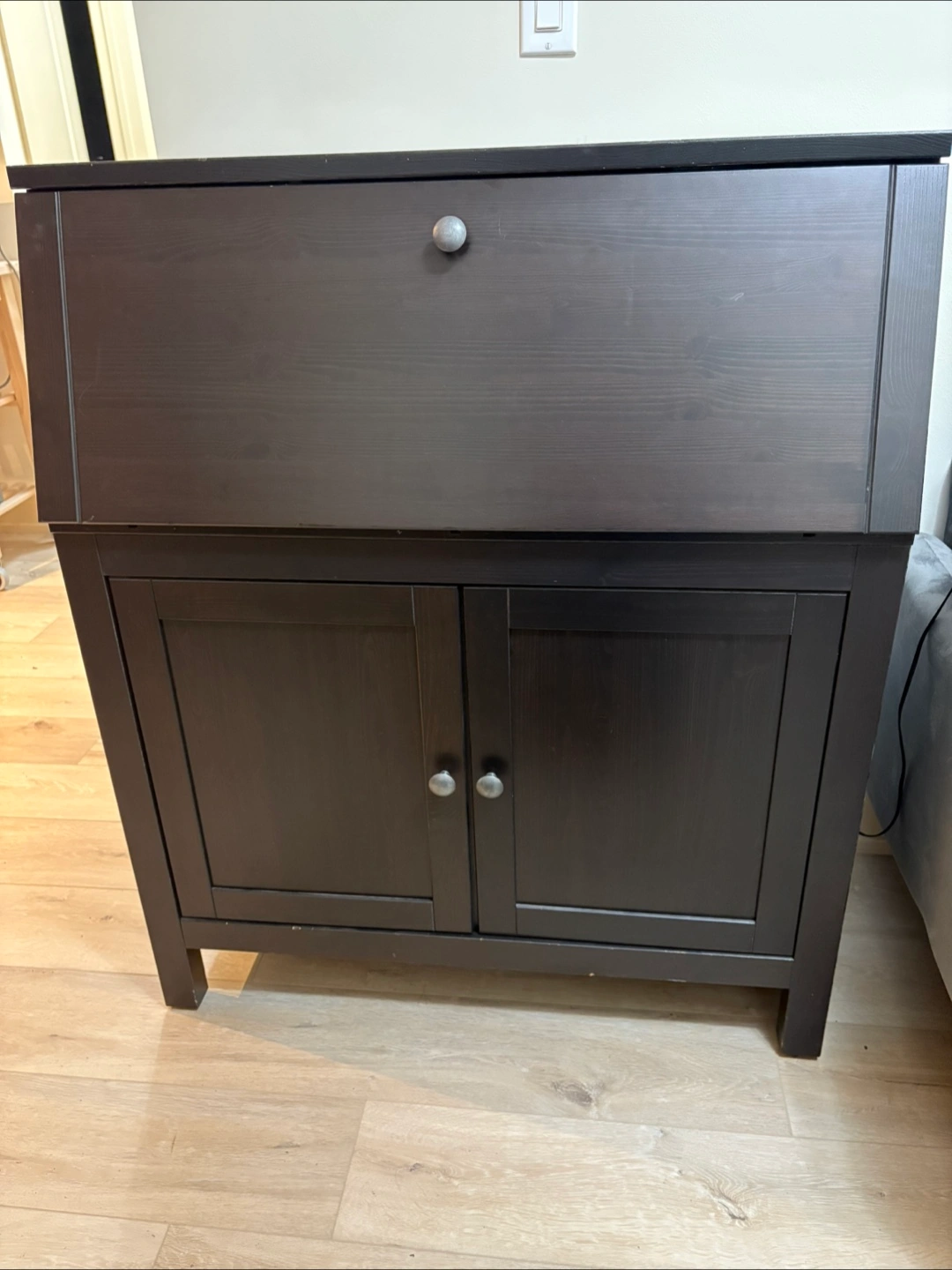 Selling a very gently used secretary desk in black/brown. It's in great condition! perfect for a small workspace. Features: drop-leaf desktop, drawers, and shelves for storage. Great for keeping your work area neat and organized!