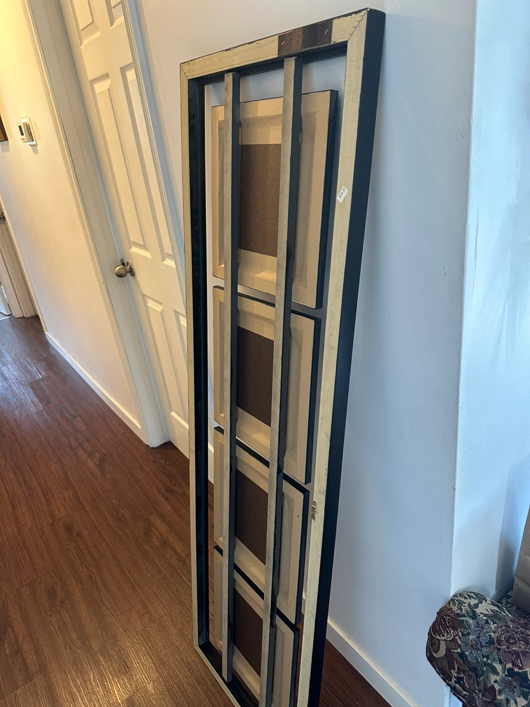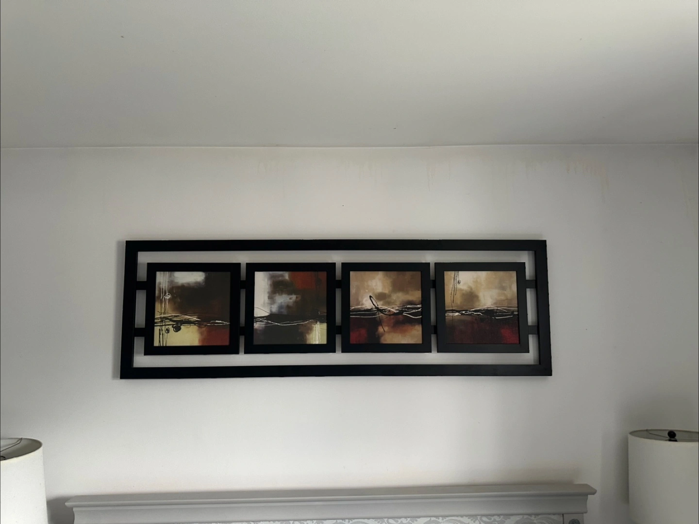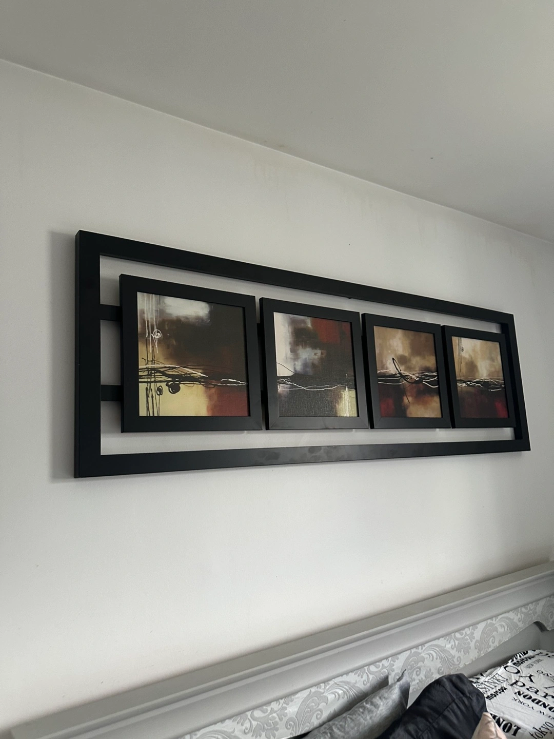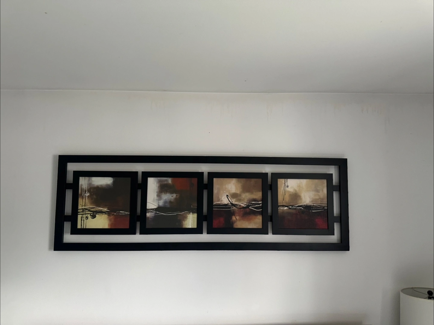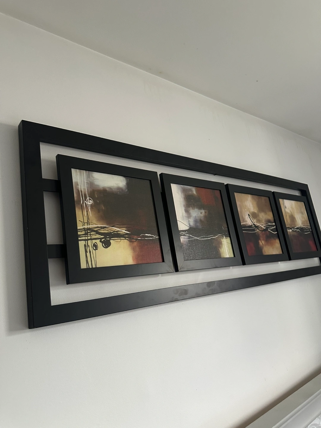 Looking to add a touch of modern art to your home? I'm selling this framed wall art piece featuring a set of four coordinating pictures. The frame is black and the art has a neutral colour palette that would suit any room. It's in great condition and ready to hang!