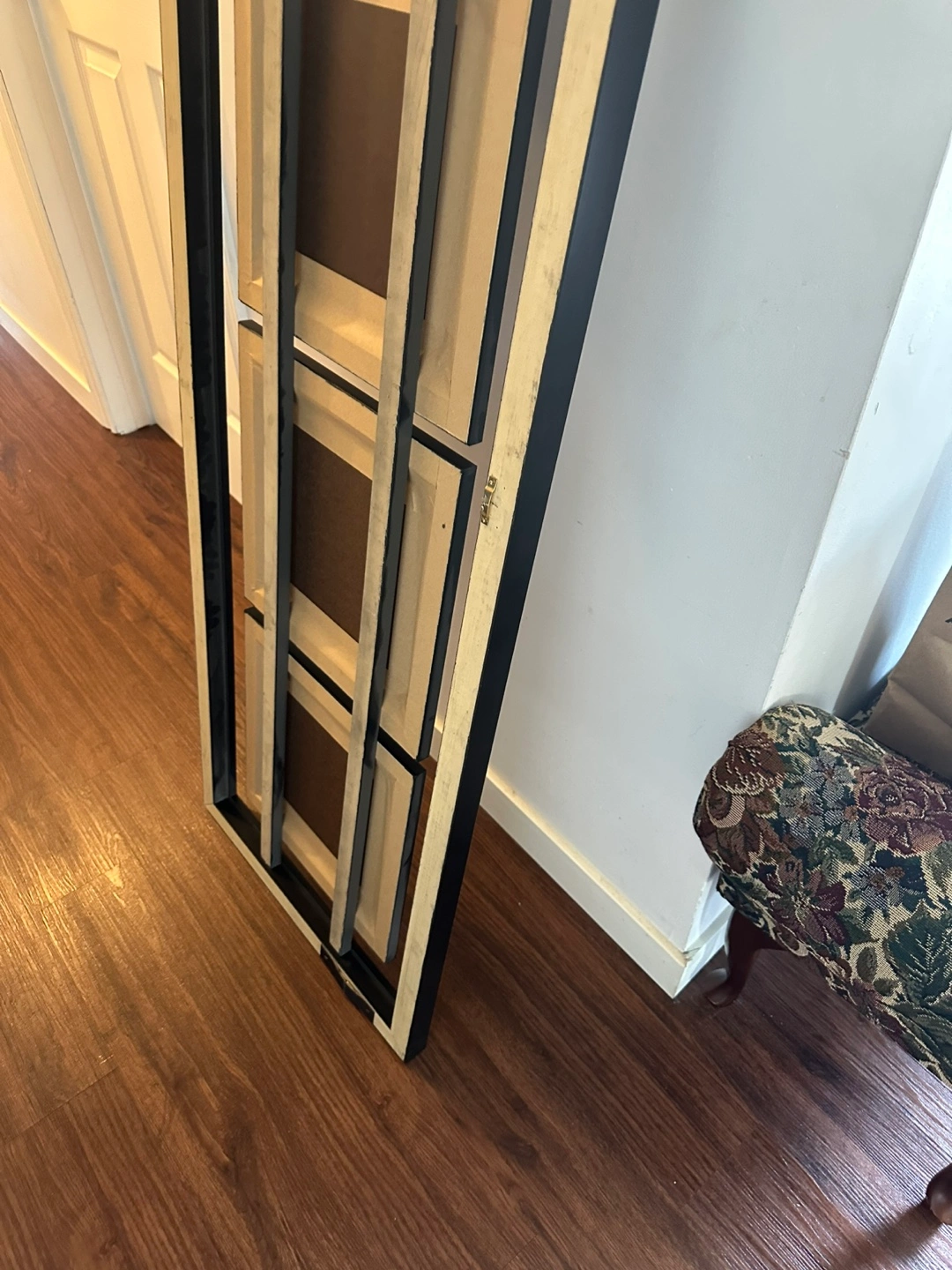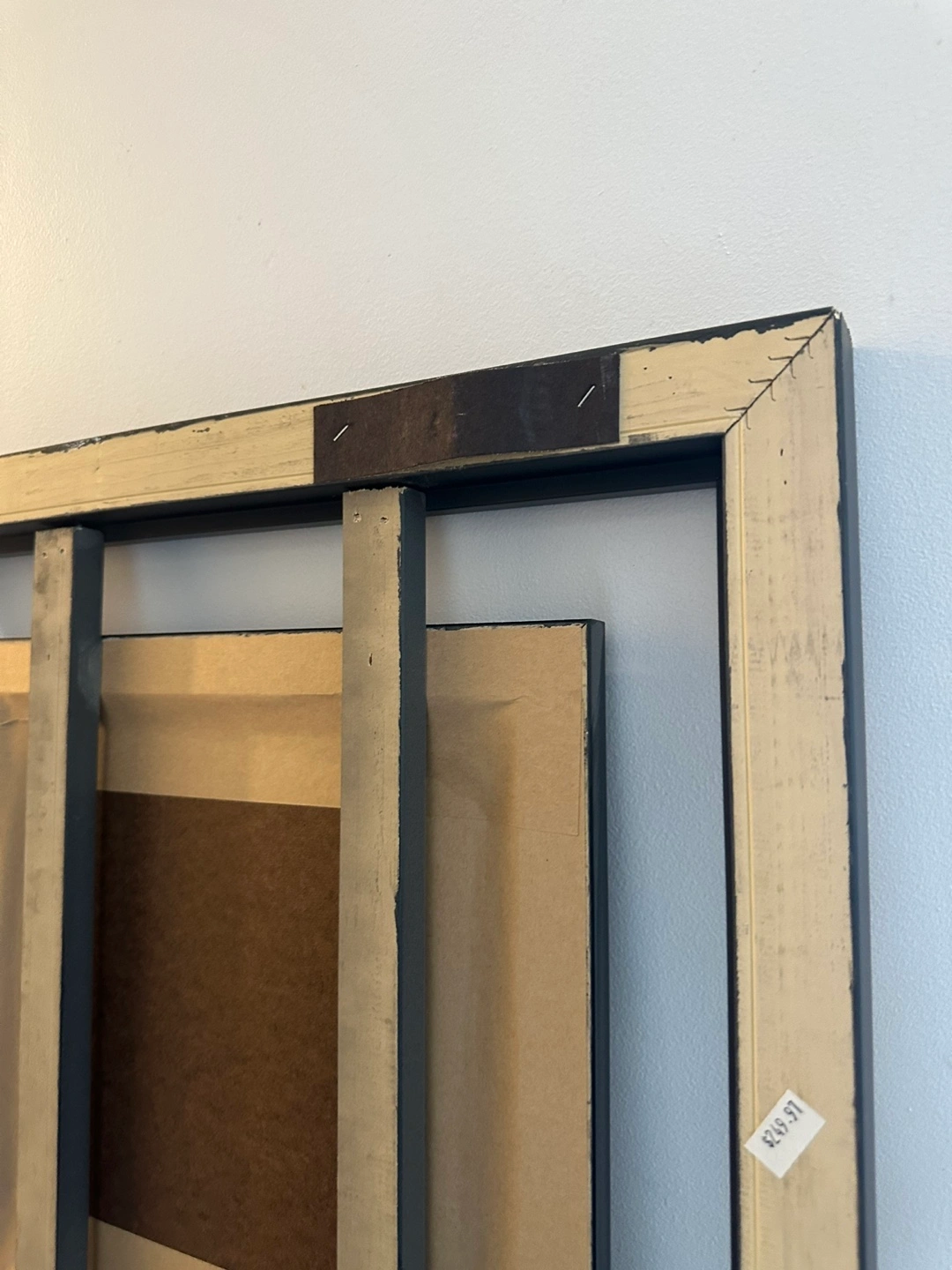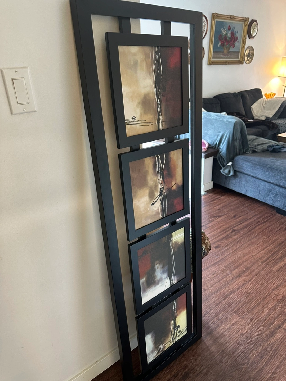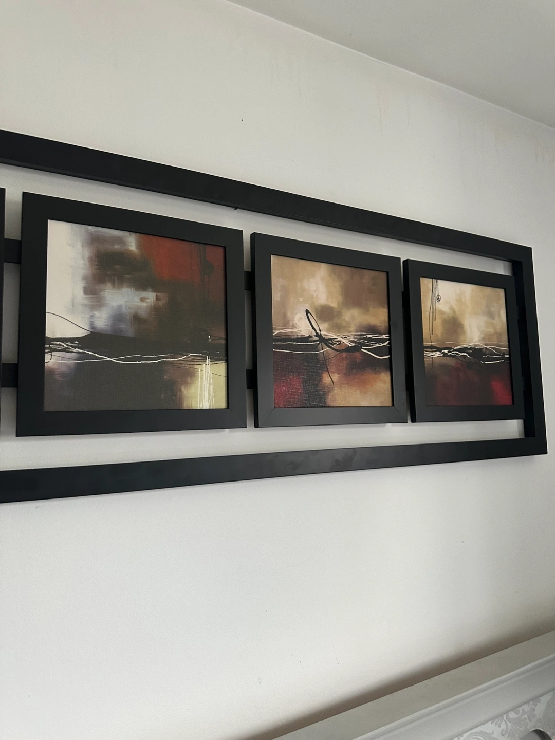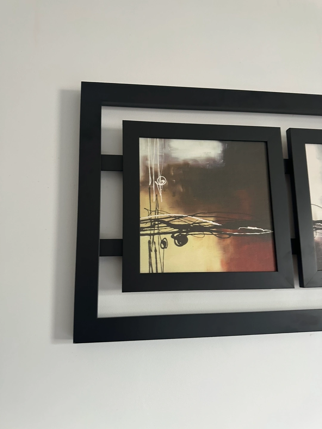 Looking to add a touch of modern art to your home? I'm selling this framed wall art piece featuring a set of four coordinating pictures. The frame is black and the art has a neutral colour palette that would suit any room. It's in great condition and ready to hang!
