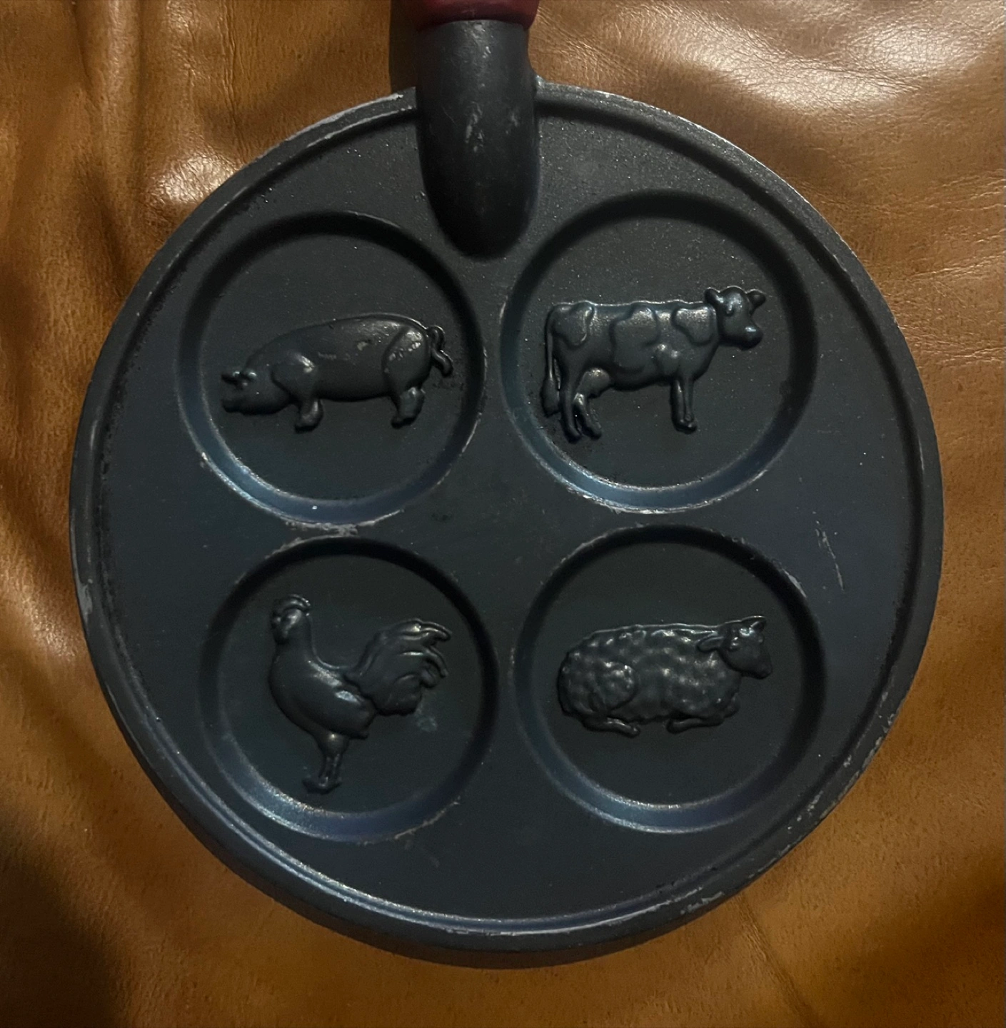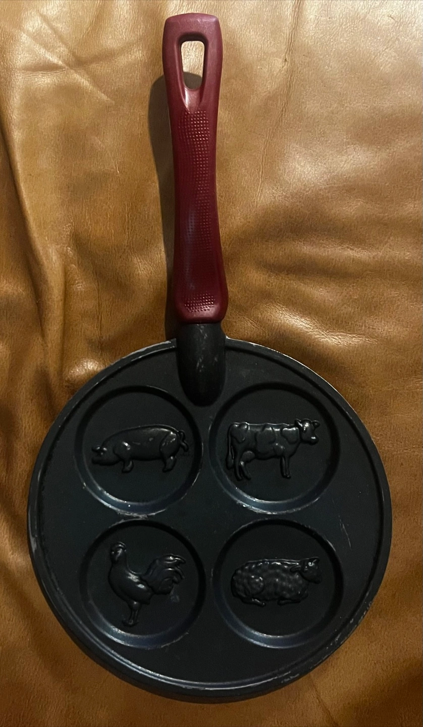 -Cast iron pancake pan for making mini-pancakes -Farm animal imprint design -Heat-proof handle -Great for kids and special occasions! -Good condition Pickup in City Park area Cash or EMT 306-221-8592