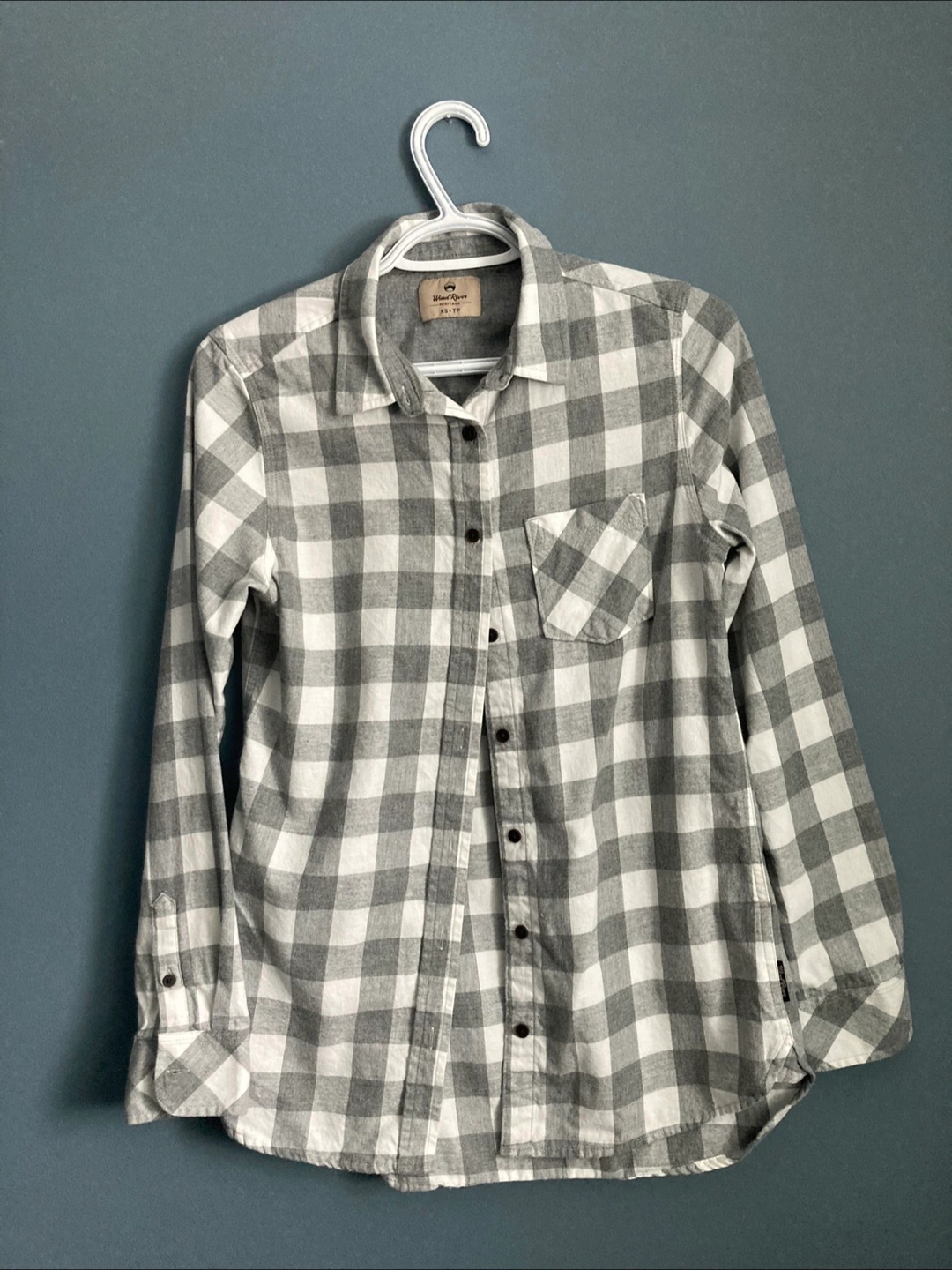 Cozy Wind River Heritage flannel shirt in size XS. It's a stylish grey and white plaid pattern, perfect for layering or wearing on its own. Made of 100% cotton, it's super comfy and breathable. A great addition to any wardrobe!